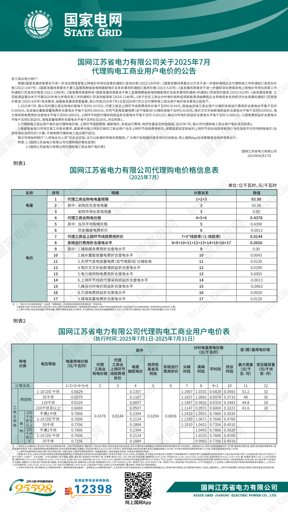 江苏省7月份代理购电工商业用户电价表