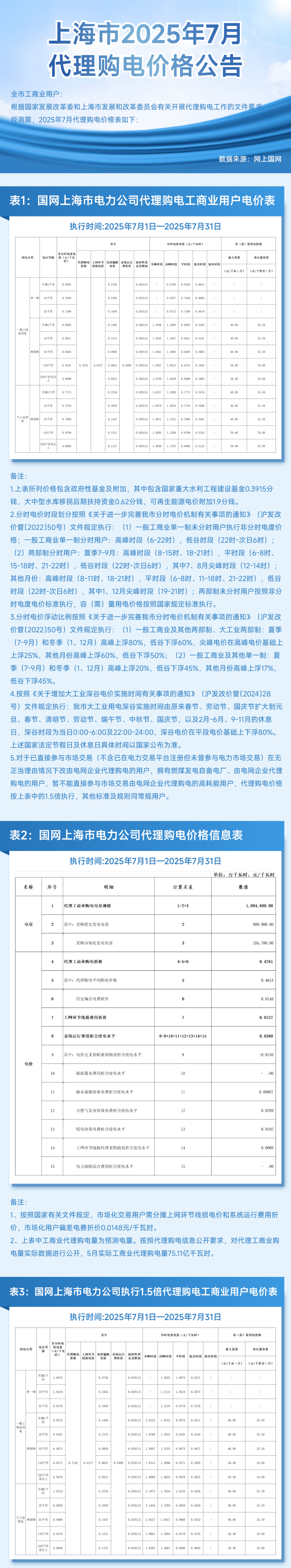 上海市7月份代理购电工商业用户电价表