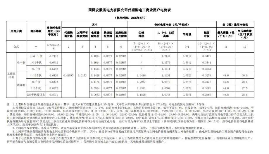 安徽省7月份代理购电工商业用户电价表