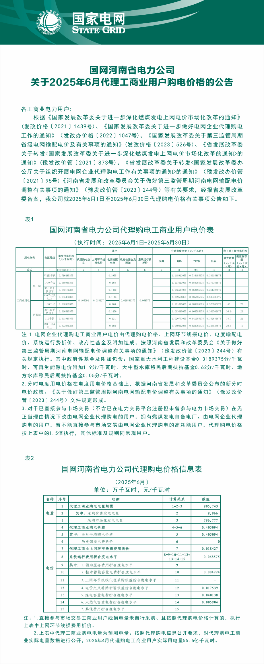 河南省7月份代理购电工商业用户电价表