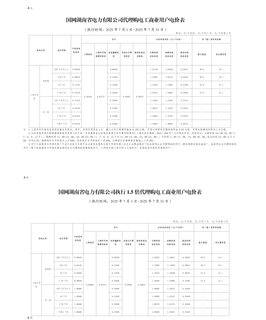 湖南省7月份代理购电工商业用户电价表