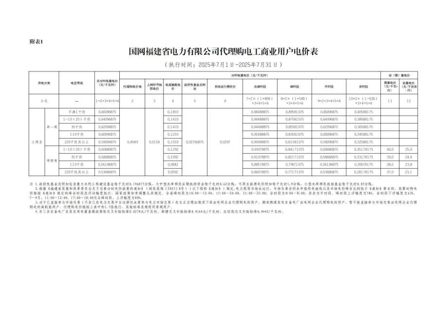 福建省7月份代理购电工商业用户电价表