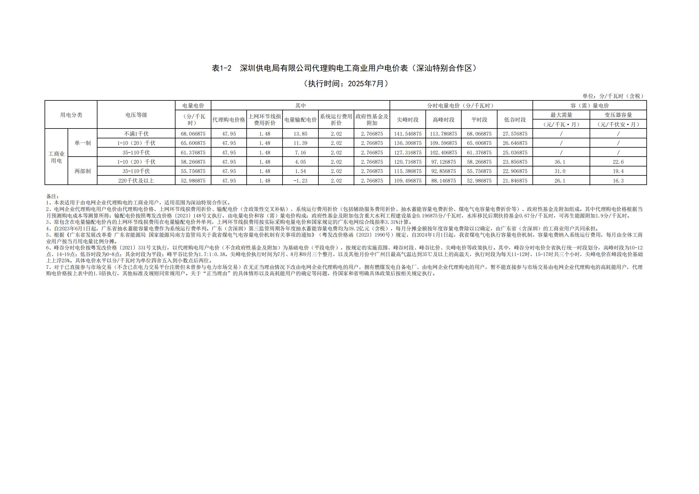深圳市7月份代理购电工商业用户电价表