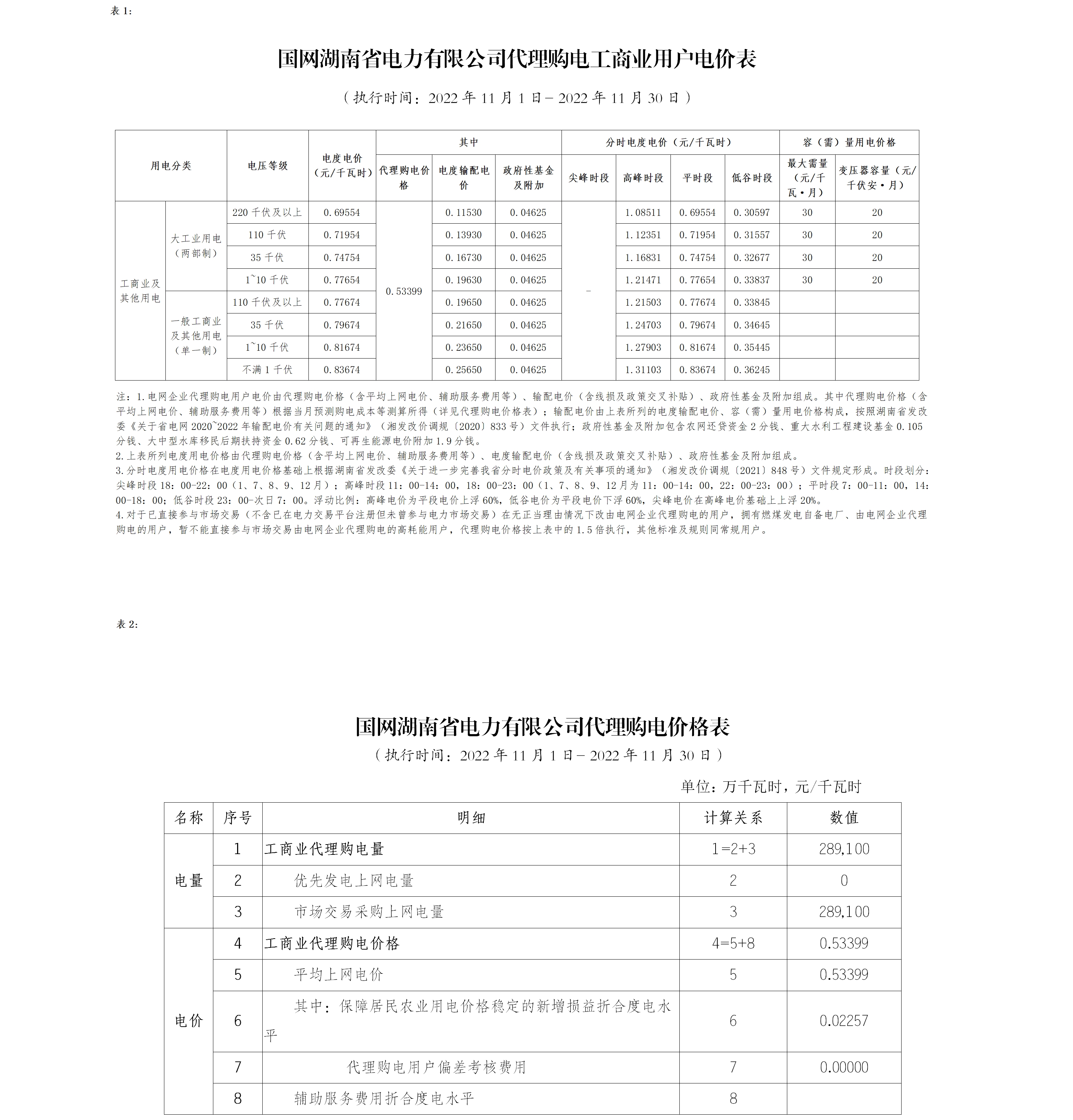 国网湖南省电力有限公司代理购电工商业用户分时电价表-2022年11月