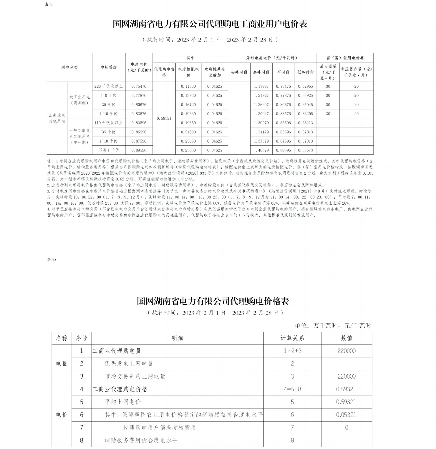 国网湖南省电力有限公司代理购电工商业用户分时电价表-2023年2月