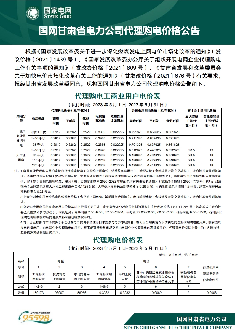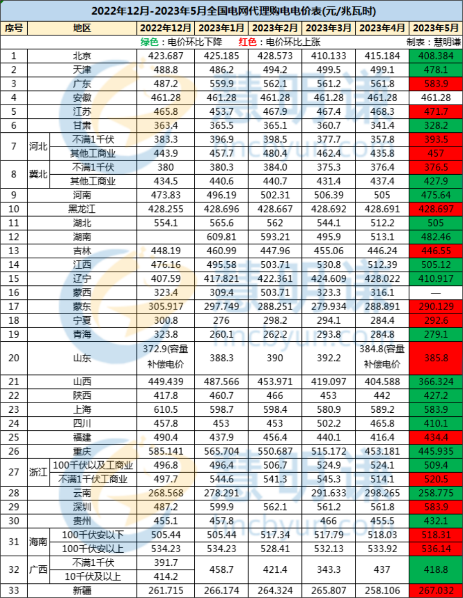 近日,国网、南网陆续发布了5月代理购电价格,北京、天津、甘肃、河北部分地区、河南、湖北、湖南、辽宁、山西、青海、广西等大部分省市代理购电价格出现下滑,广东、江苏、蒙东、宁夏、新疆几个省份代理购电价格上涨。