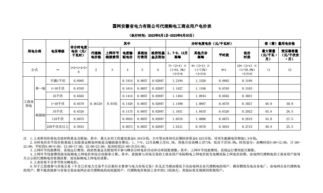 安徽省6月份代理购电工商业用户电价表
