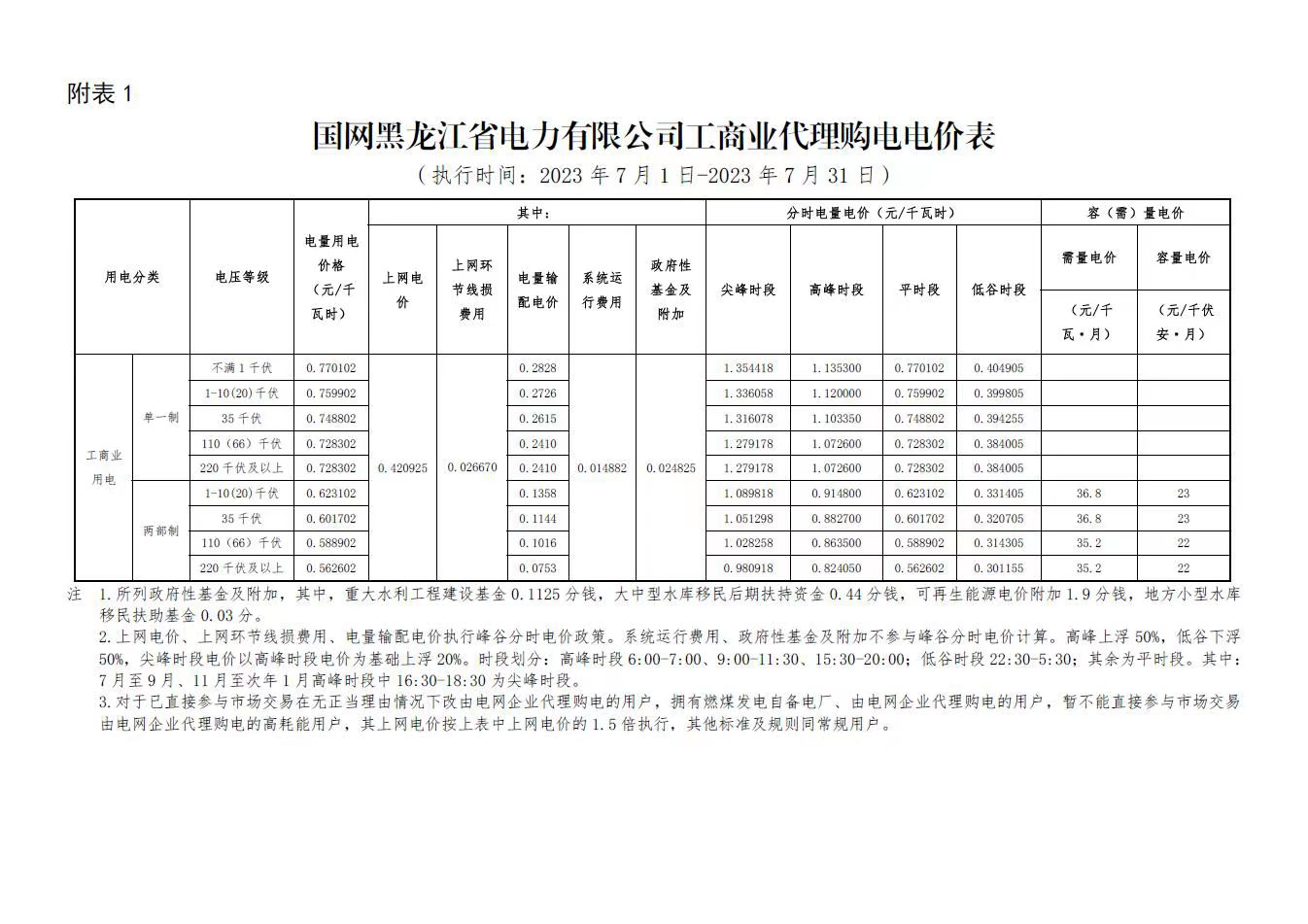 2023年7月份各省工商业电价(黑龙江、吉林、辽宁、内蒙古(蒙东))