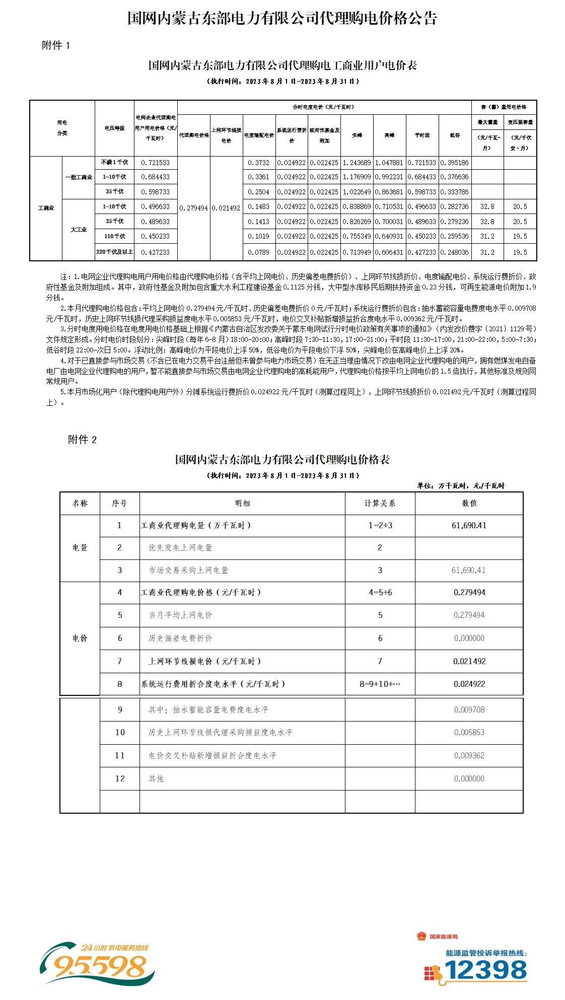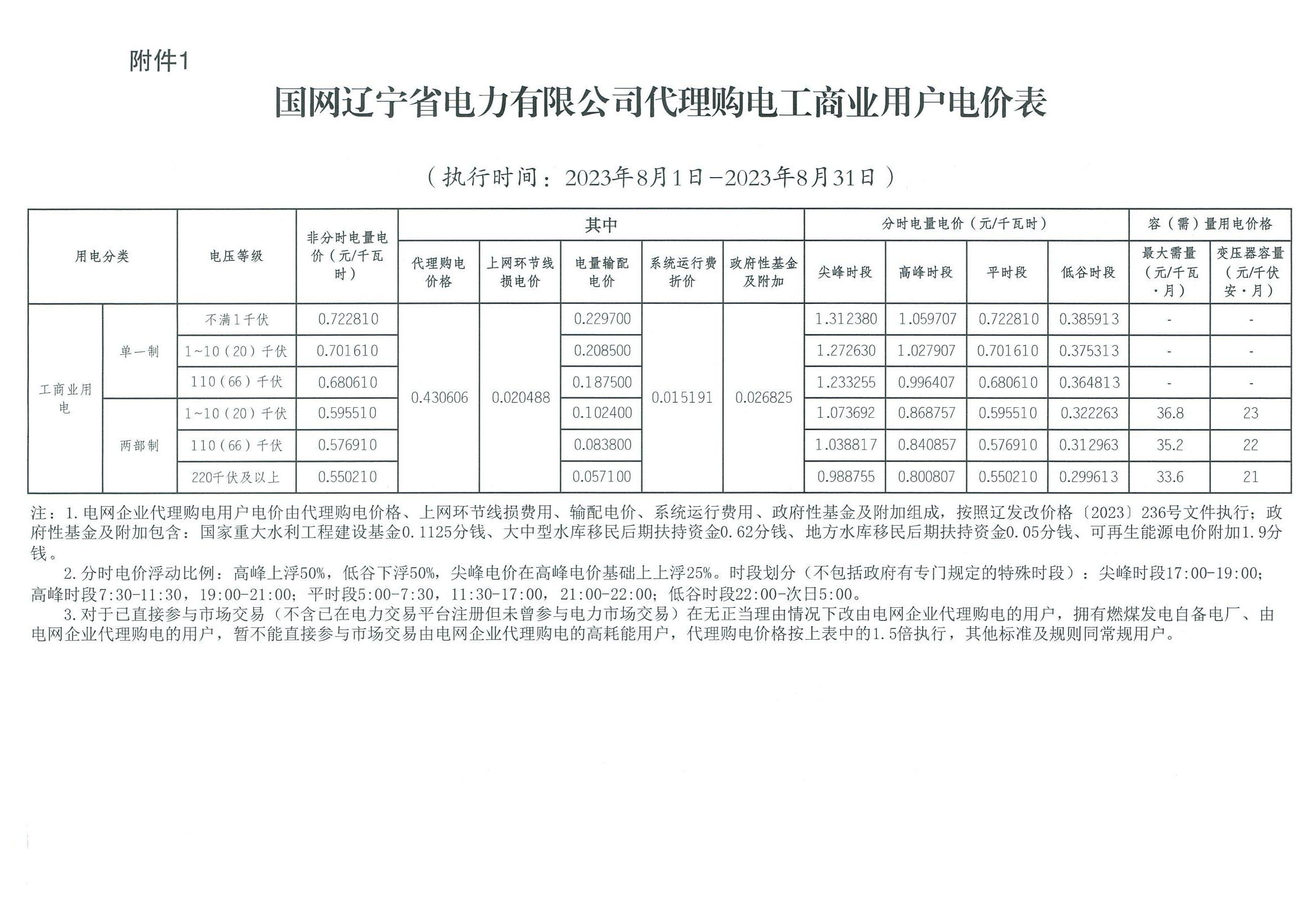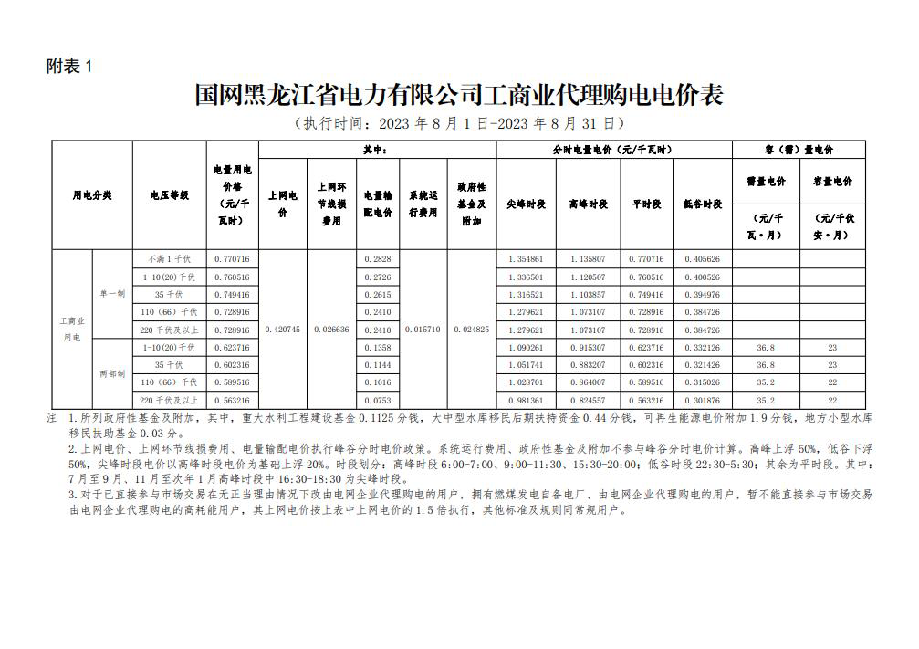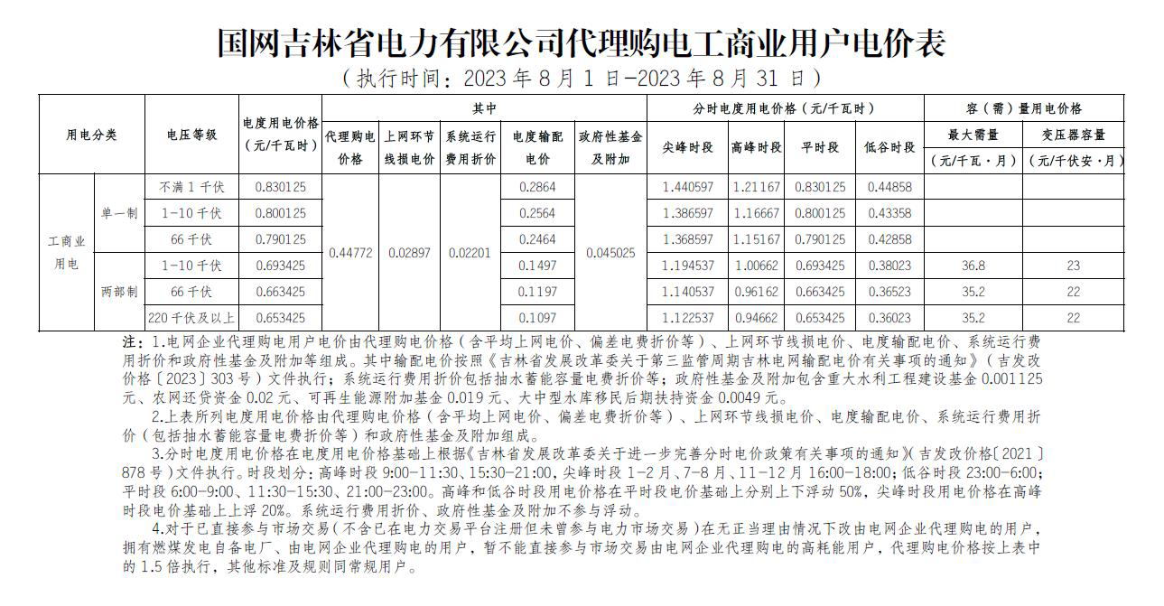 2023年8月份各省工商业电价(黑龙江、吉林、辽宁、内蒙古(蒙东))