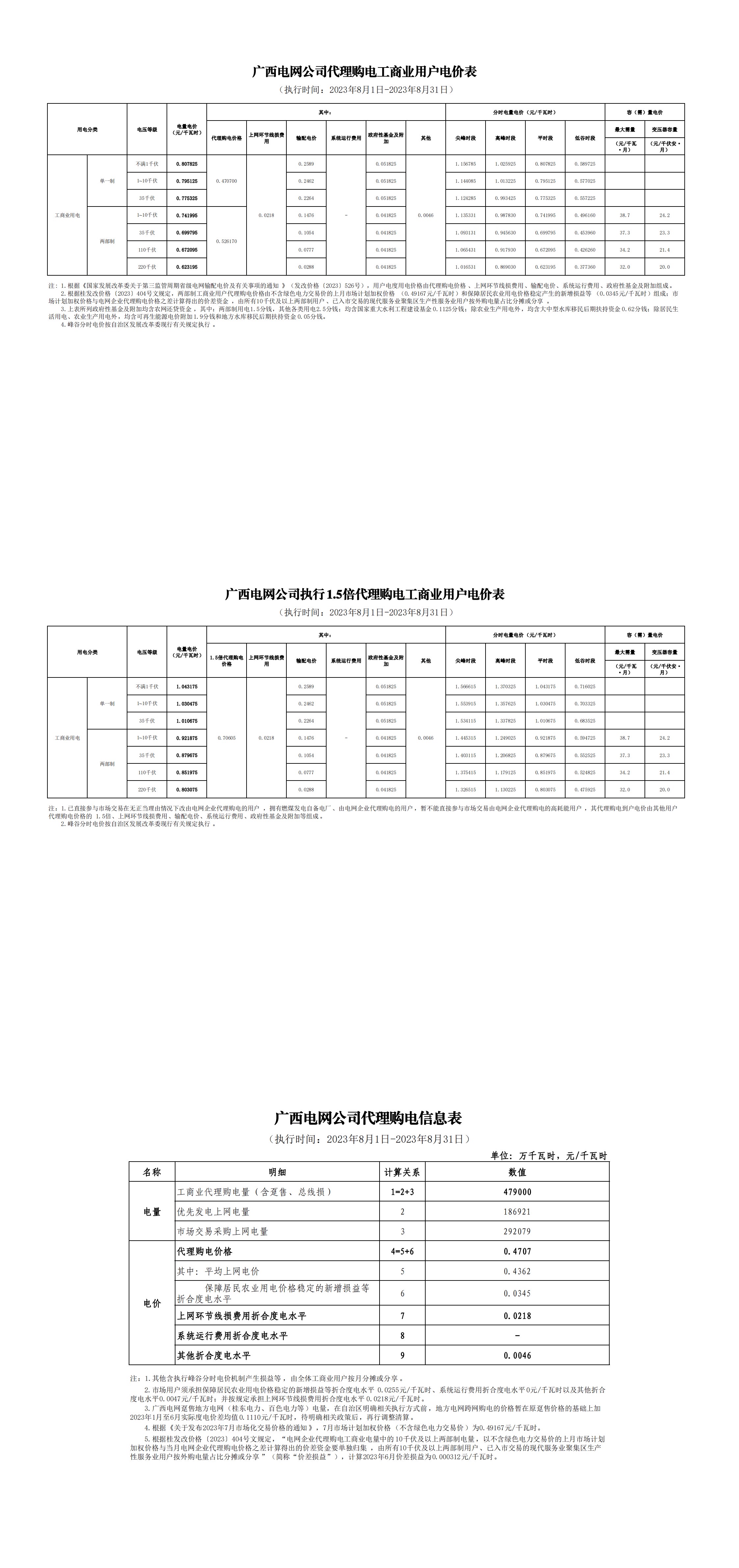 广西省8月份代理购电工商业用户电价表
