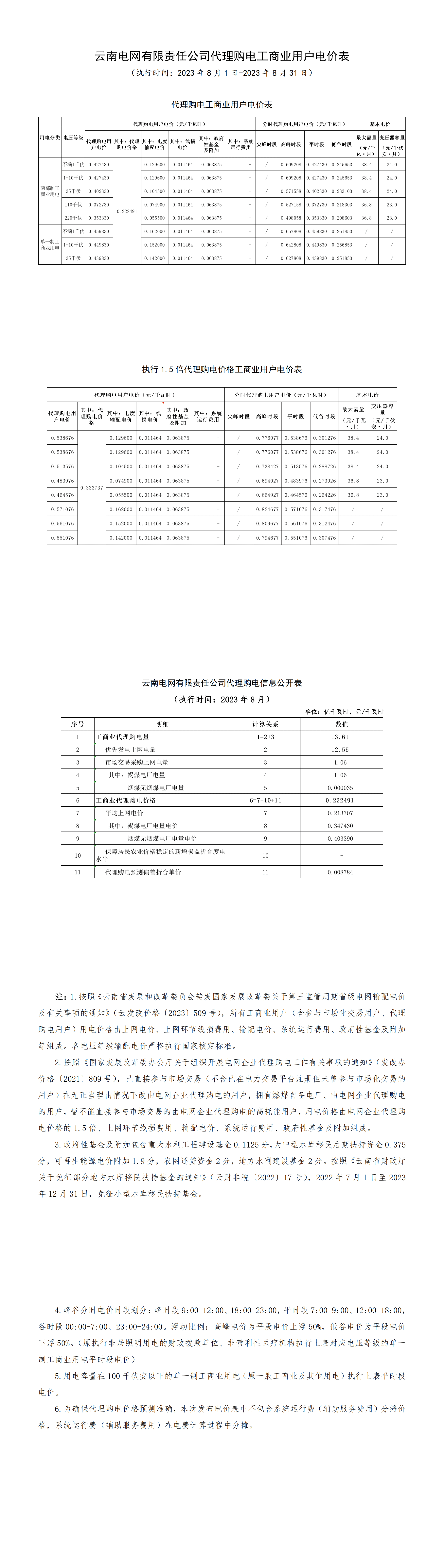 云南省8月份代理购电工商业用户电价表