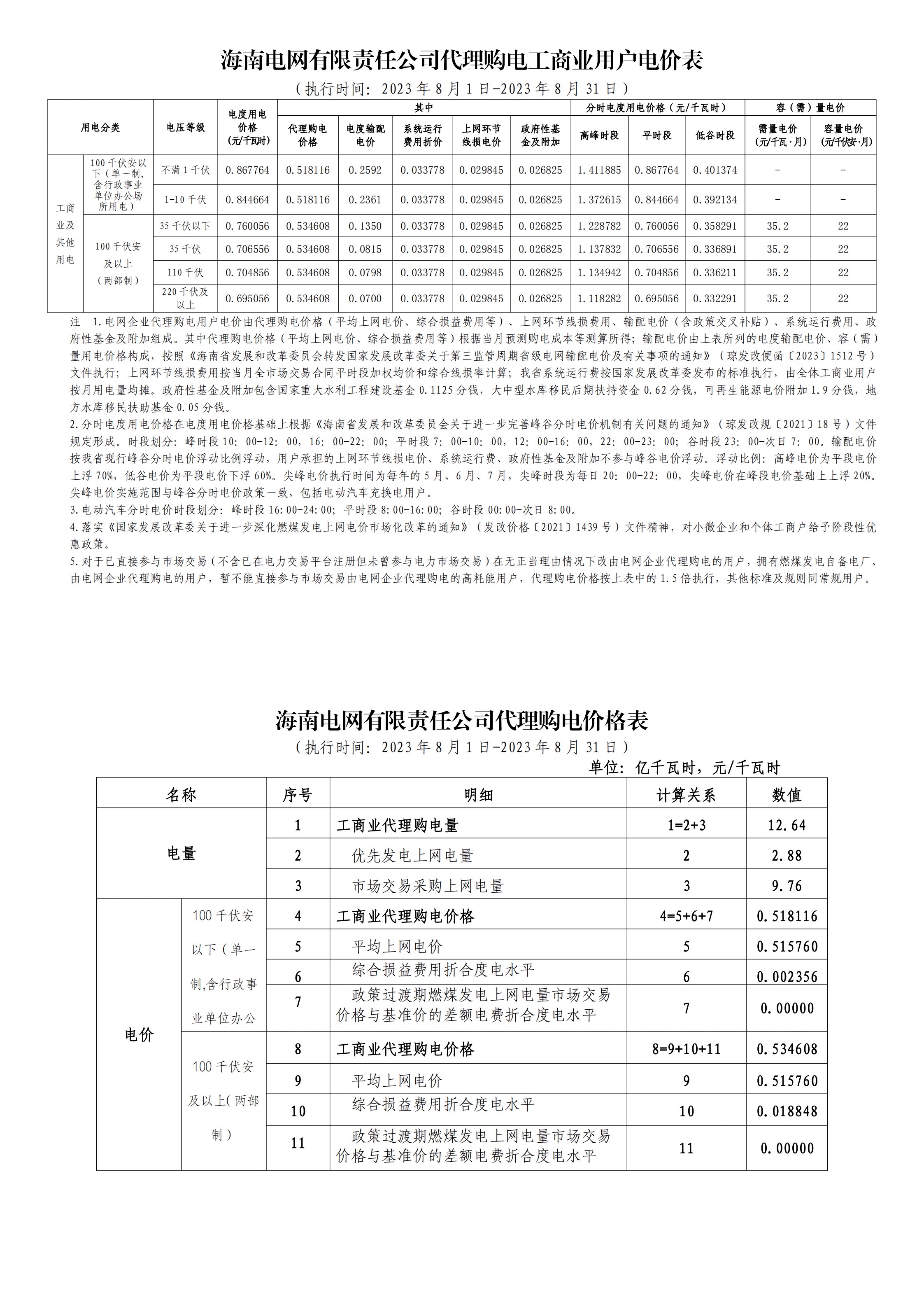 海南省8月份代理购电工商业用户电价表