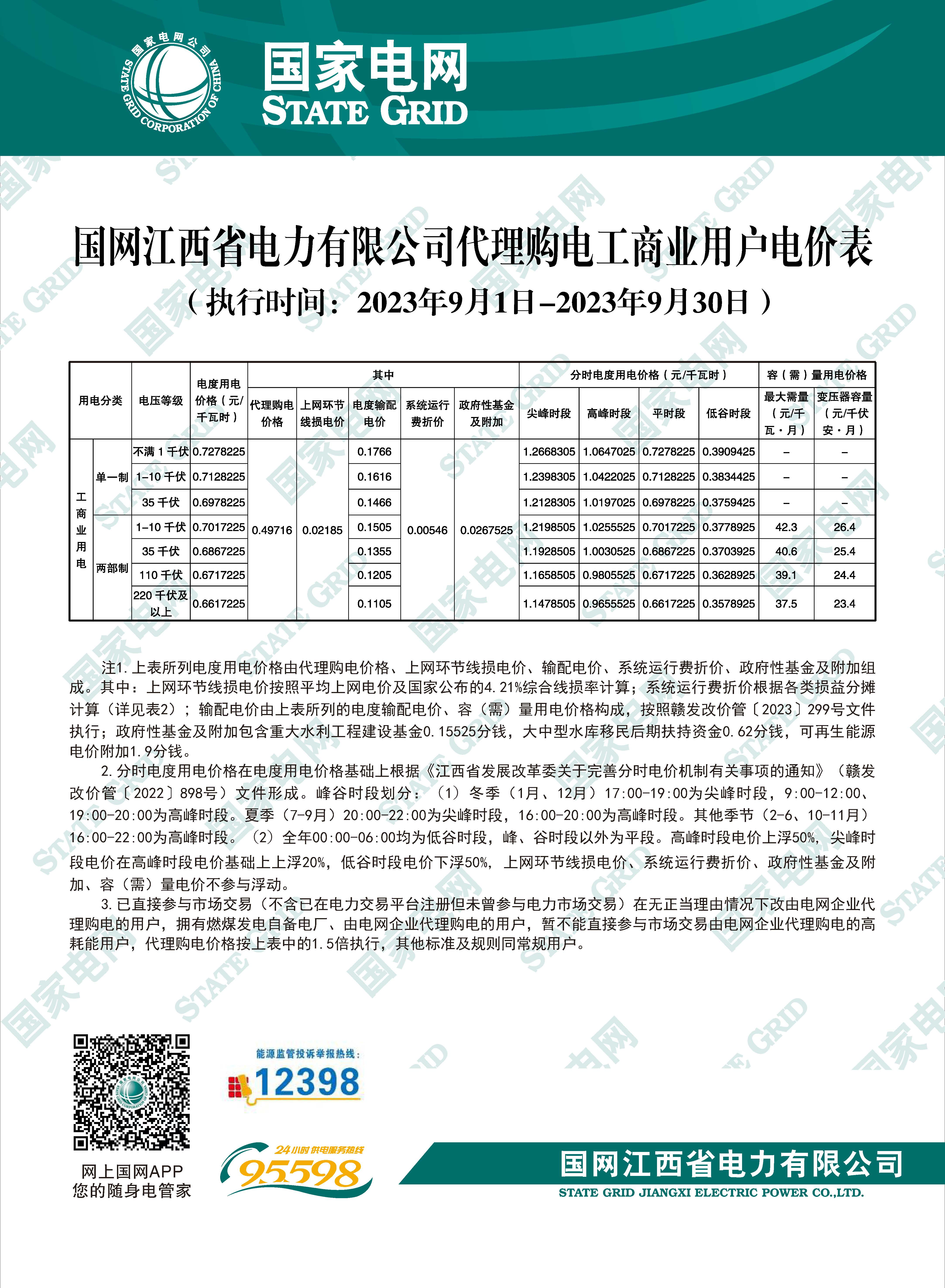 代理购电工商业用户电价表