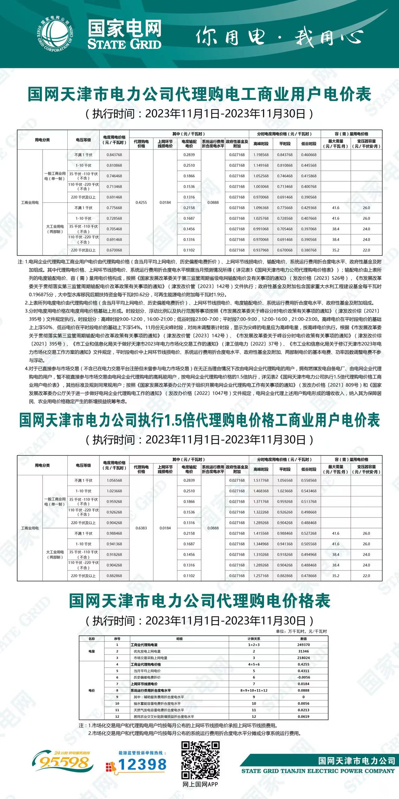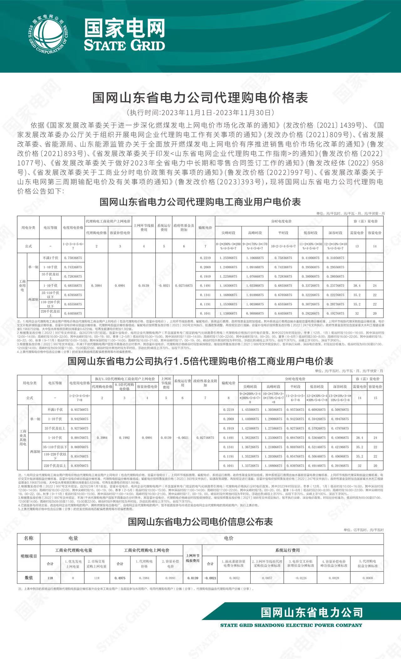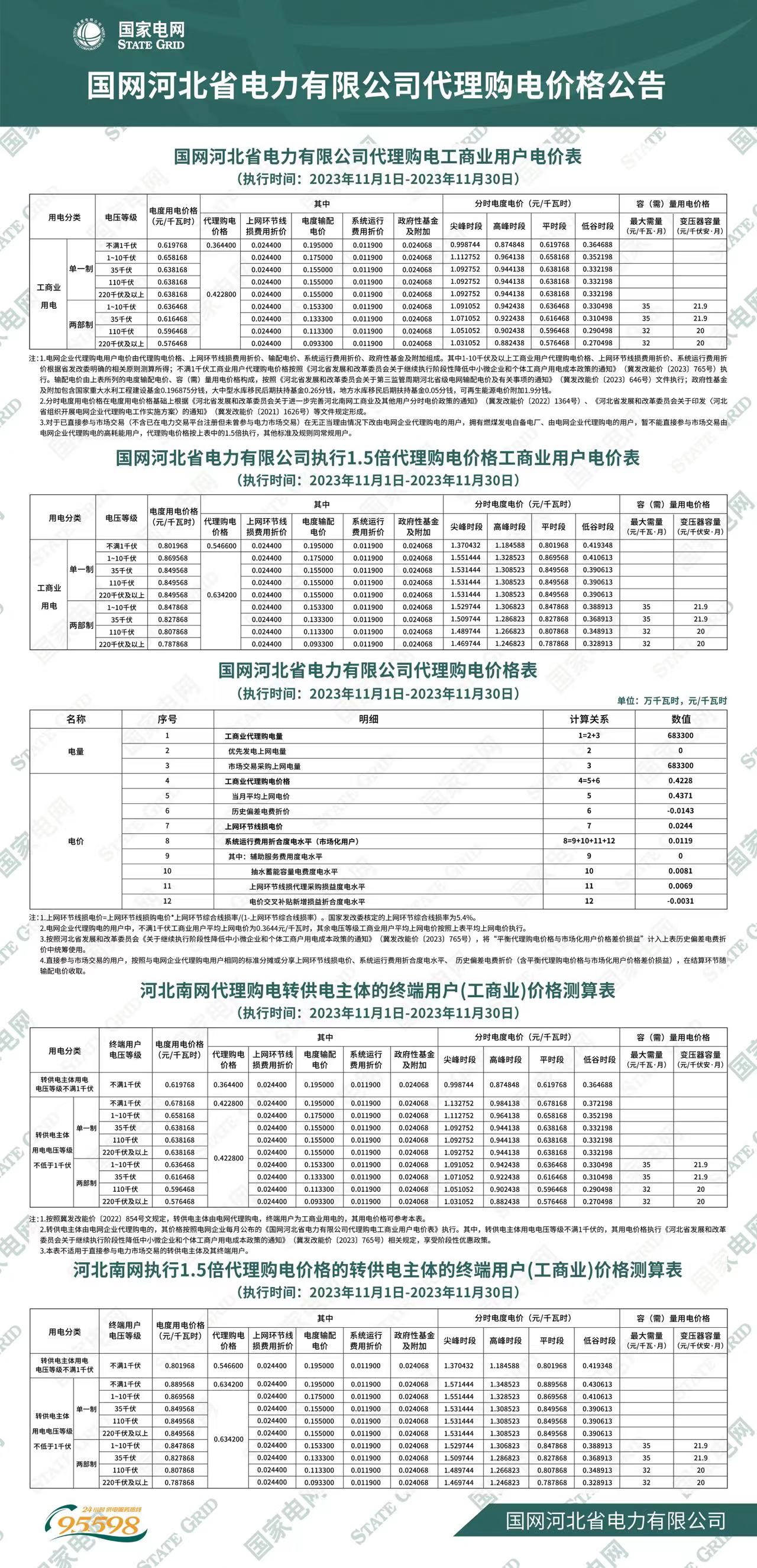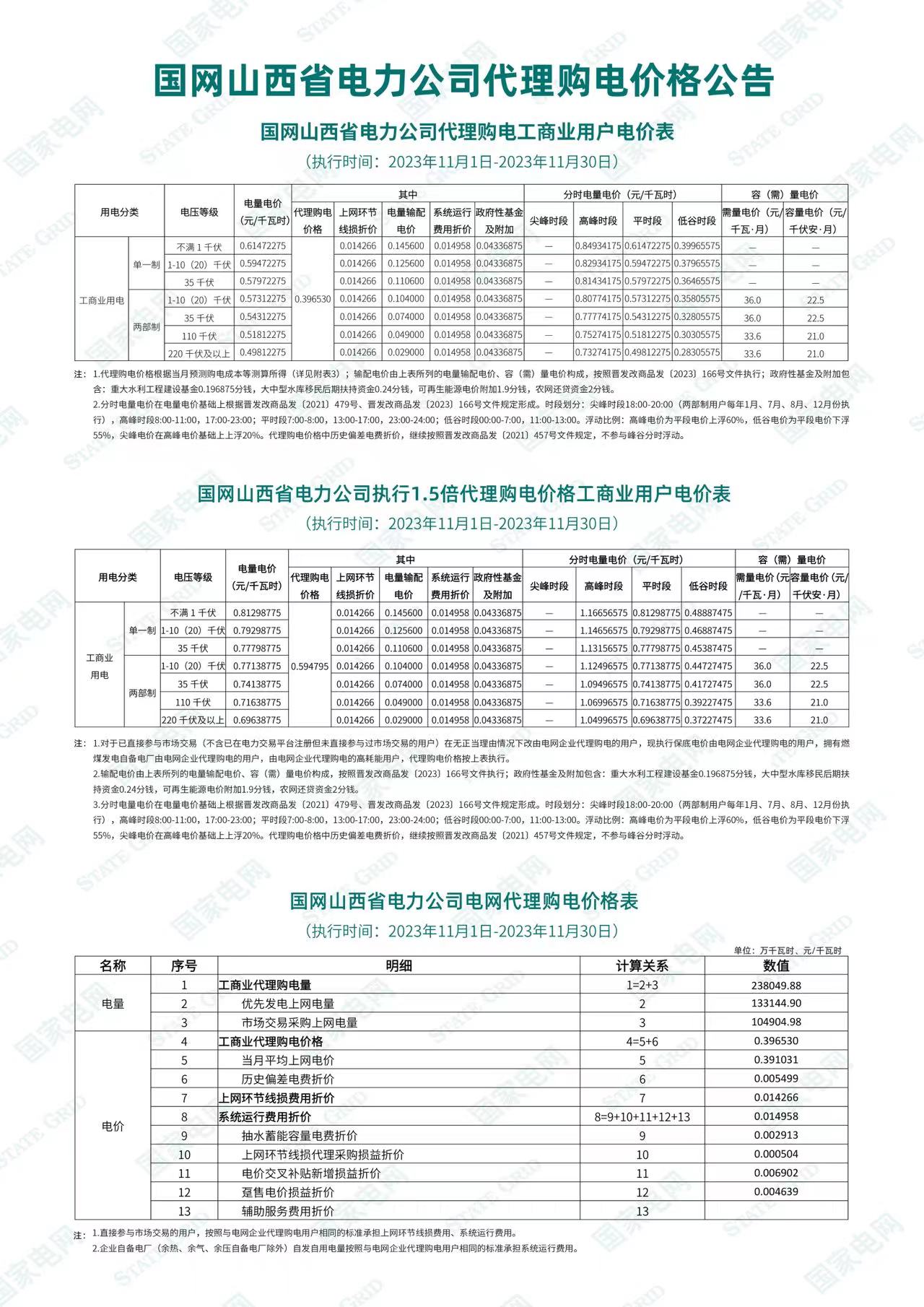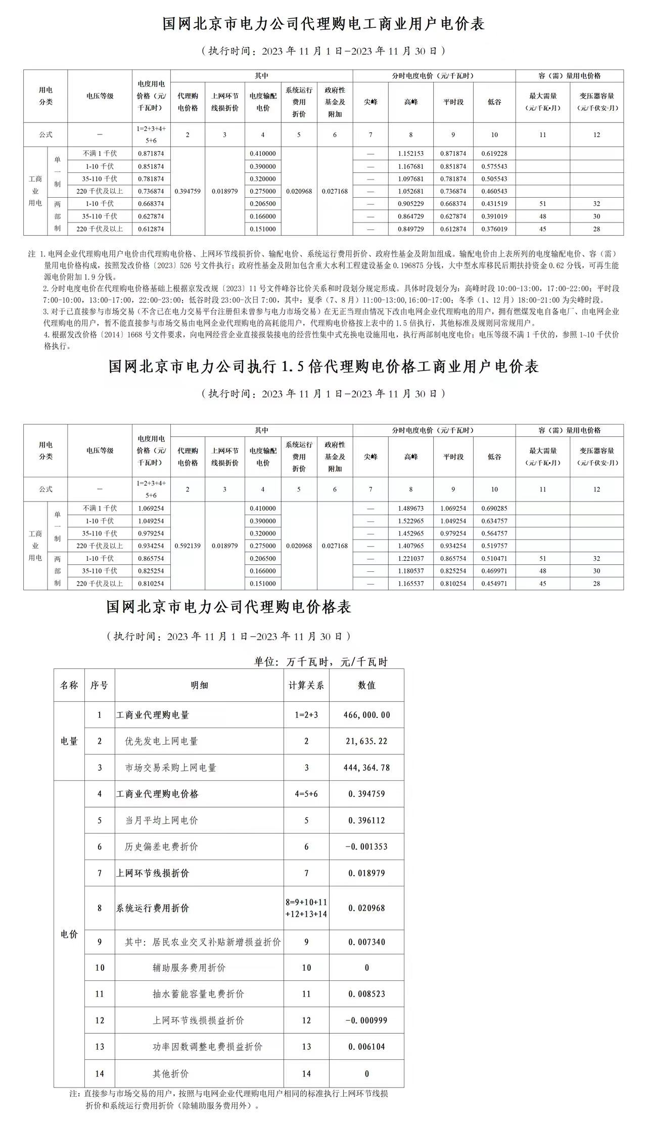 2023年11月份各省工商业电价(北京、天津、河北、山东、山西)