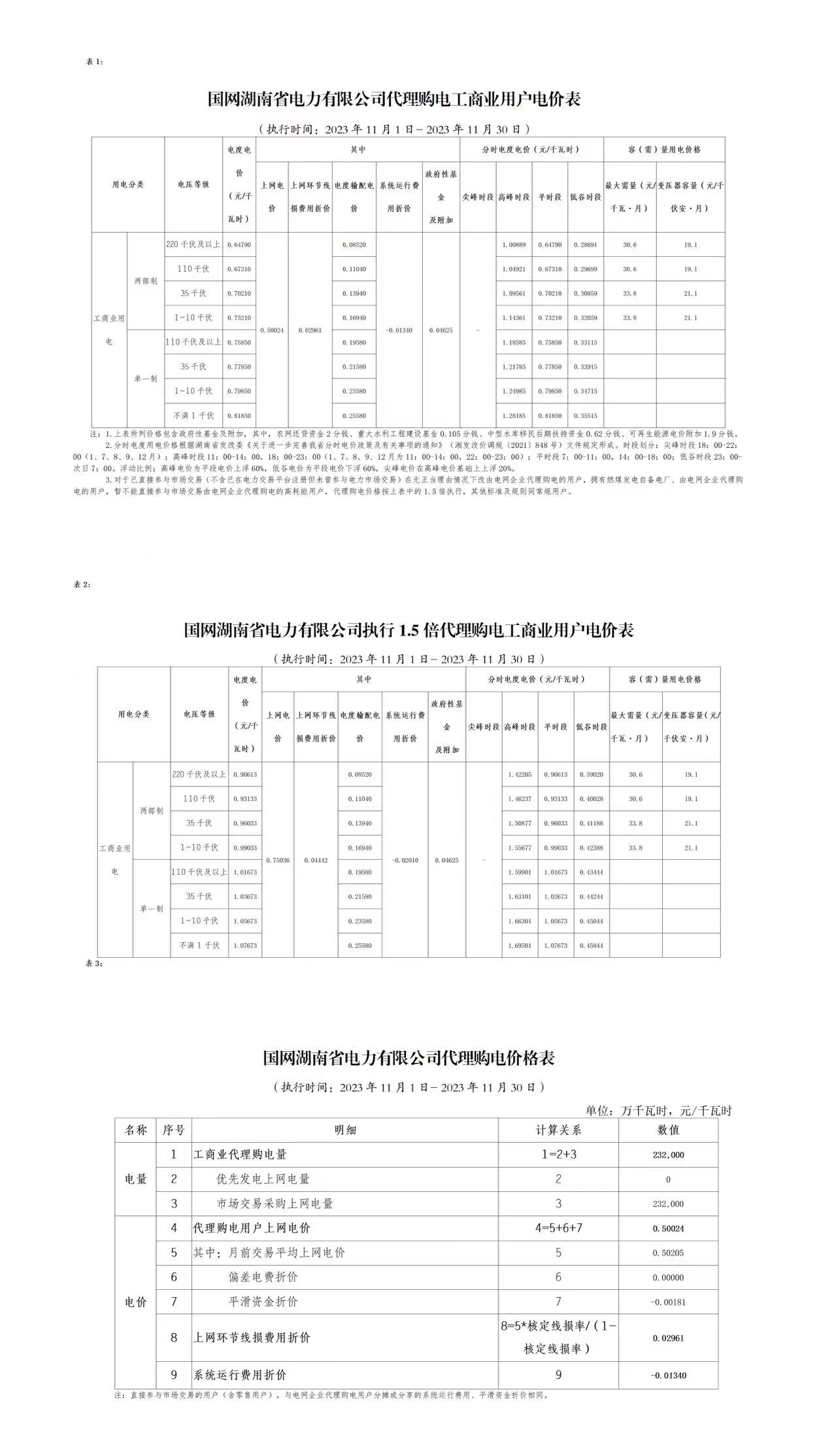 2023年11月份各省工商业电价(广东、深圳、广西、贵州、云南、海南)