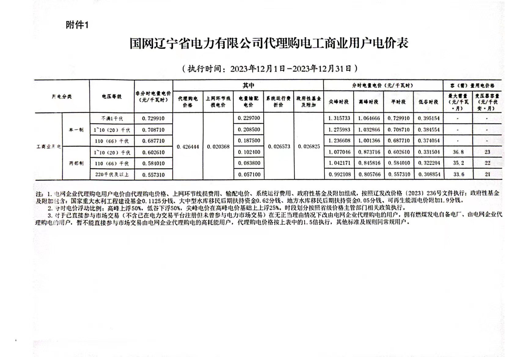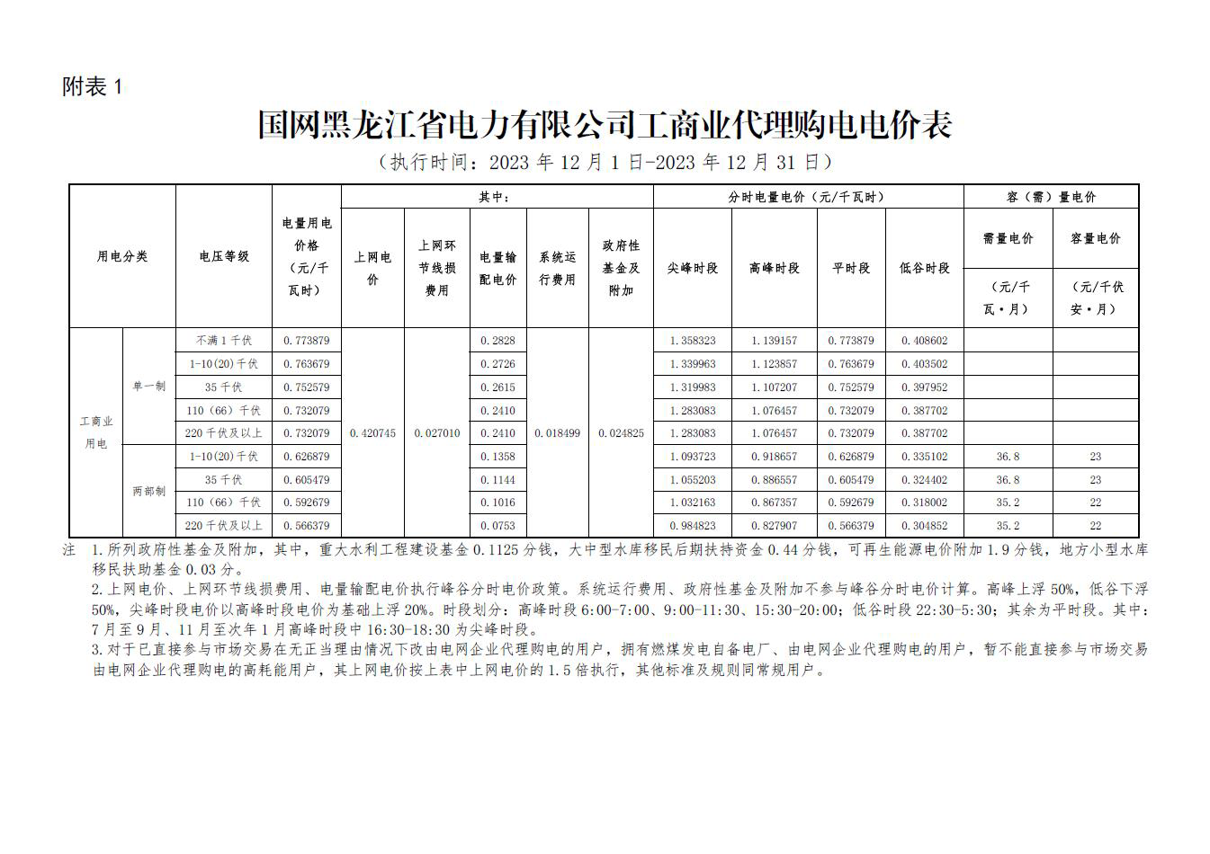 2023年12月份各省工商业电价(黑龙江、吉林、辽宁、内蒙古(蒙东))