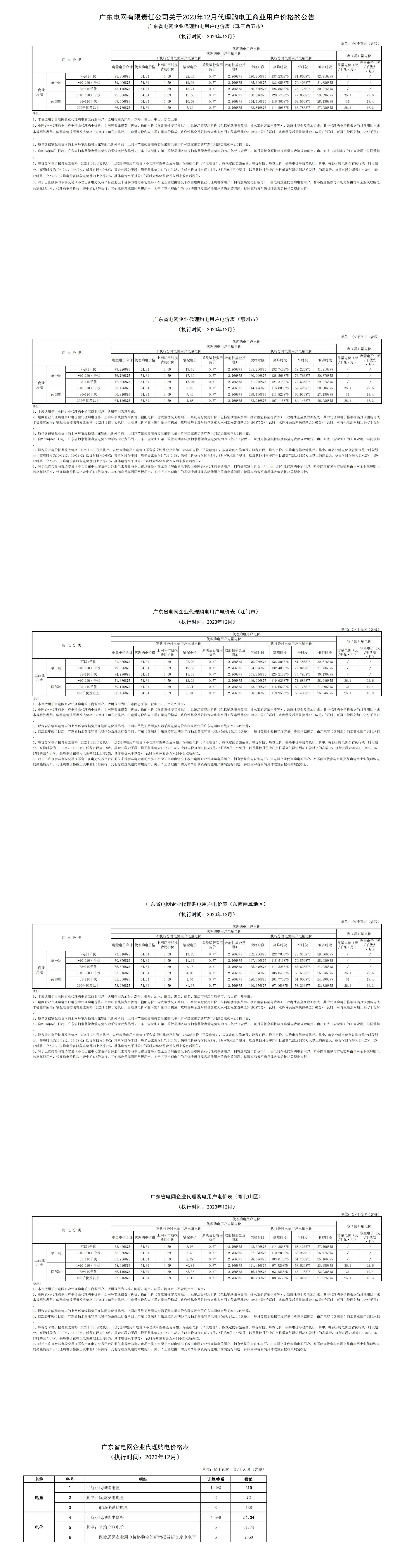 广东省12月份代理购电工商业用户电价表