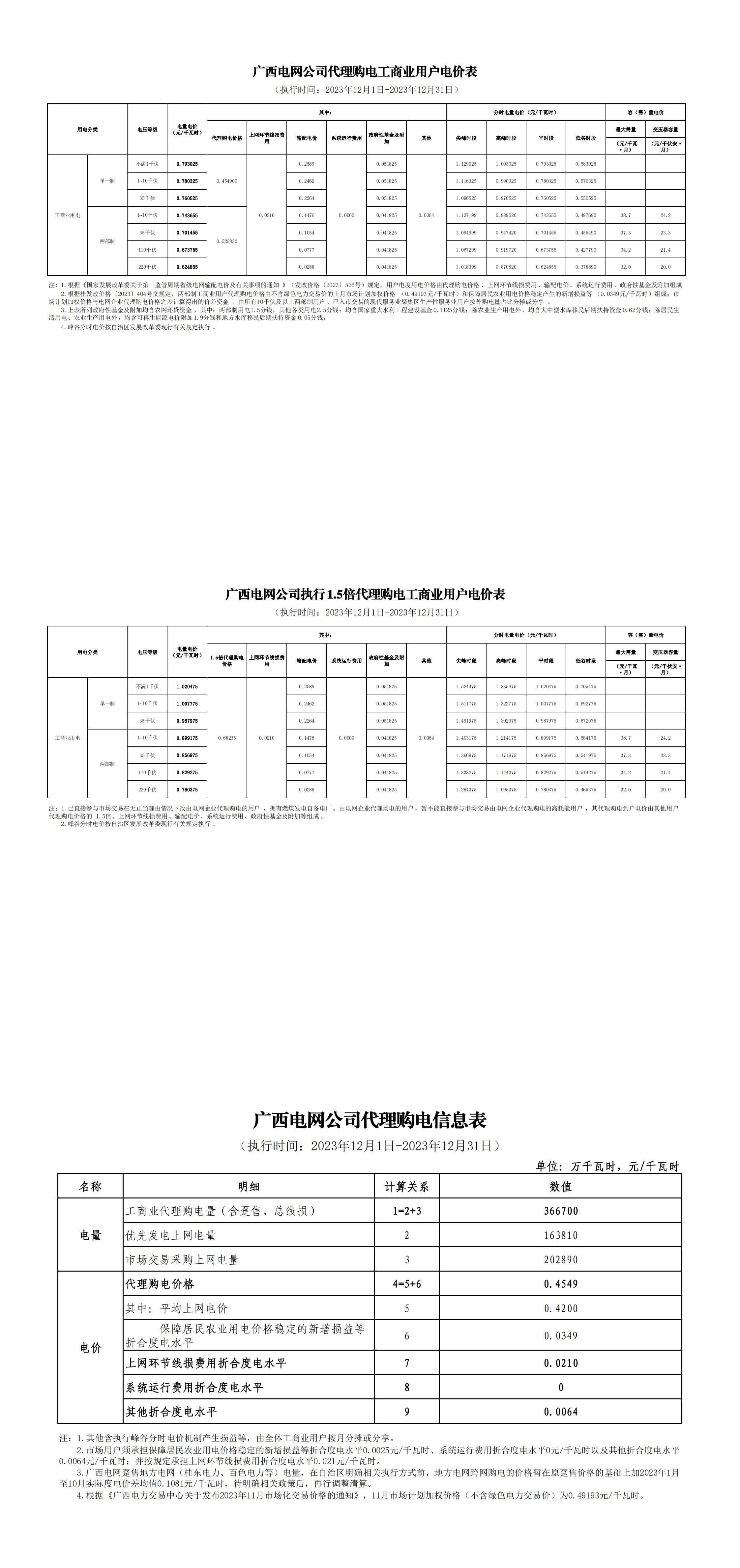 广西省12月份代理购电工商业用户电价表