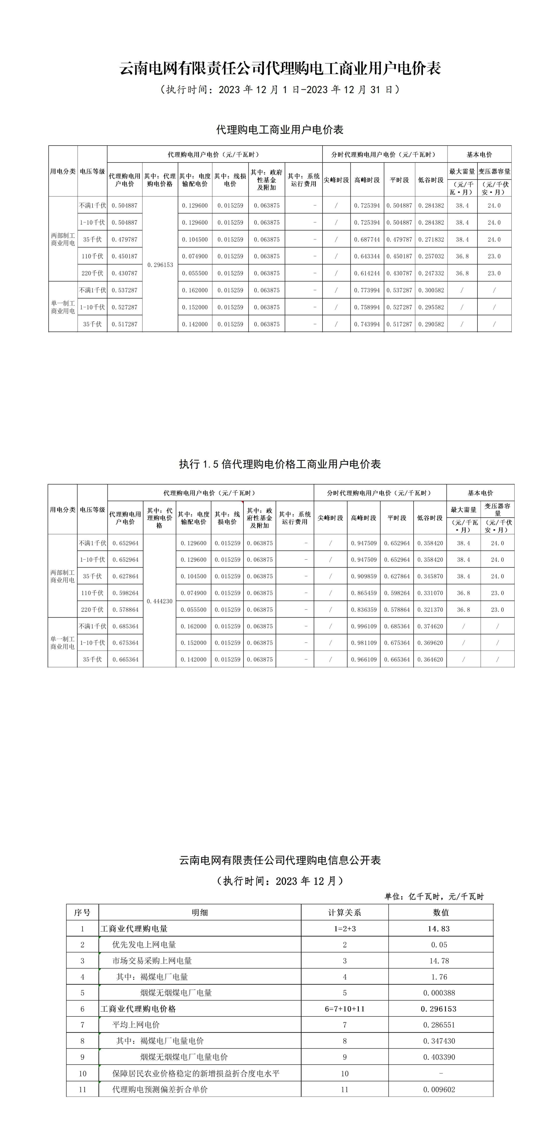 云南省12月份代理购电工商业用户电价表