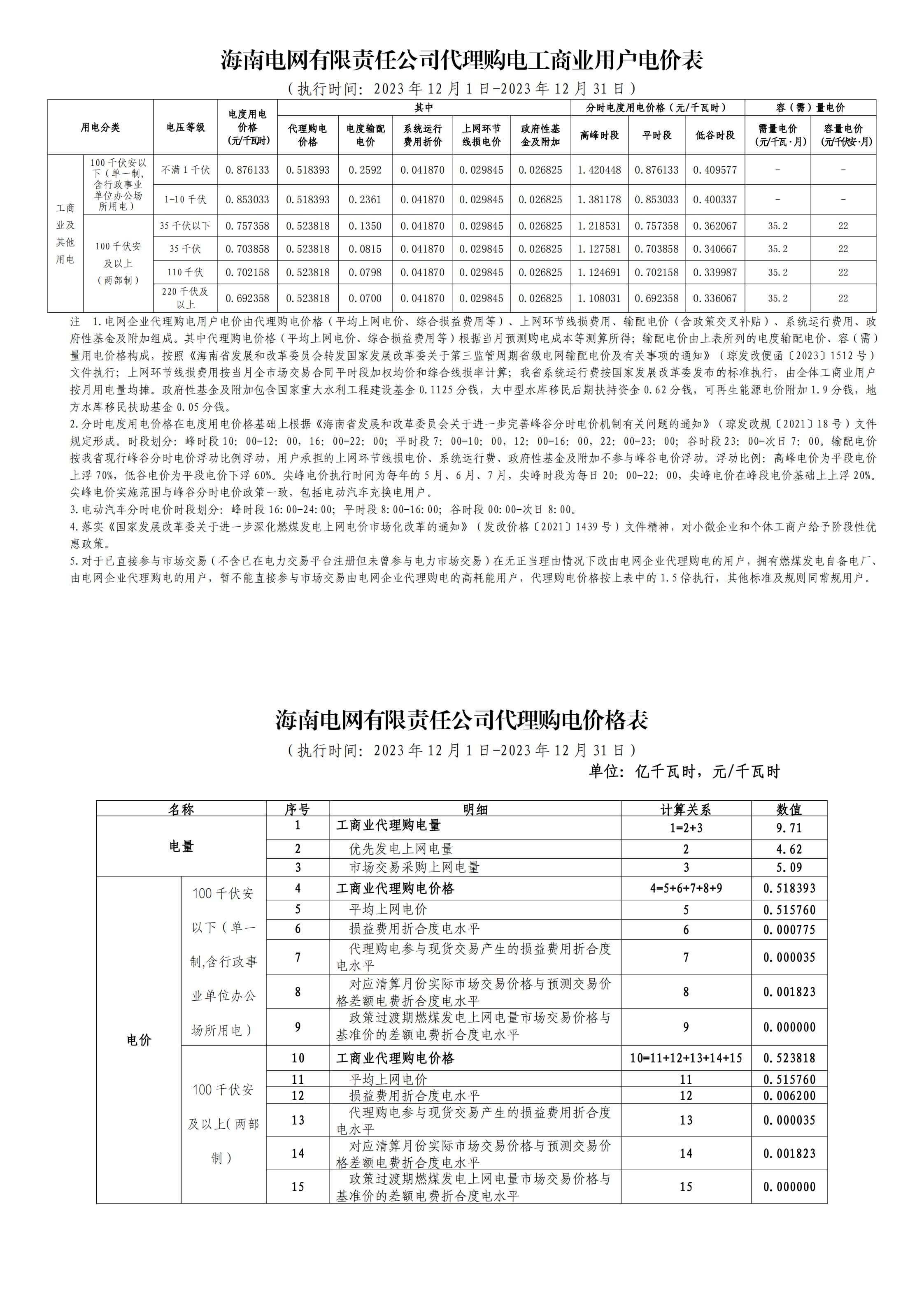 海南省12月份代理购电工商业用户电价表