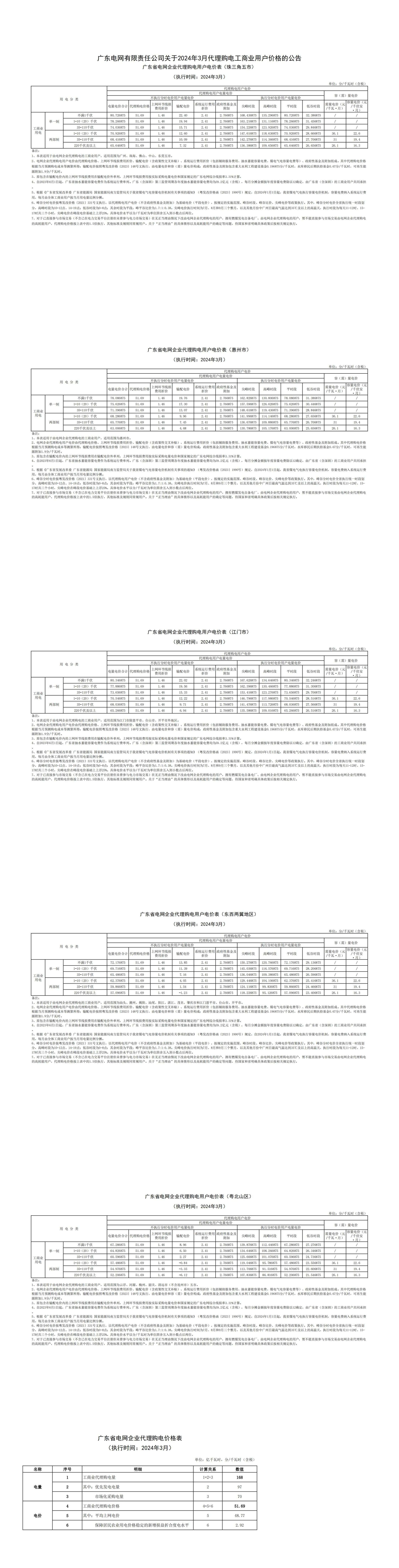 广东省3月份代理购电工商业用户电价表