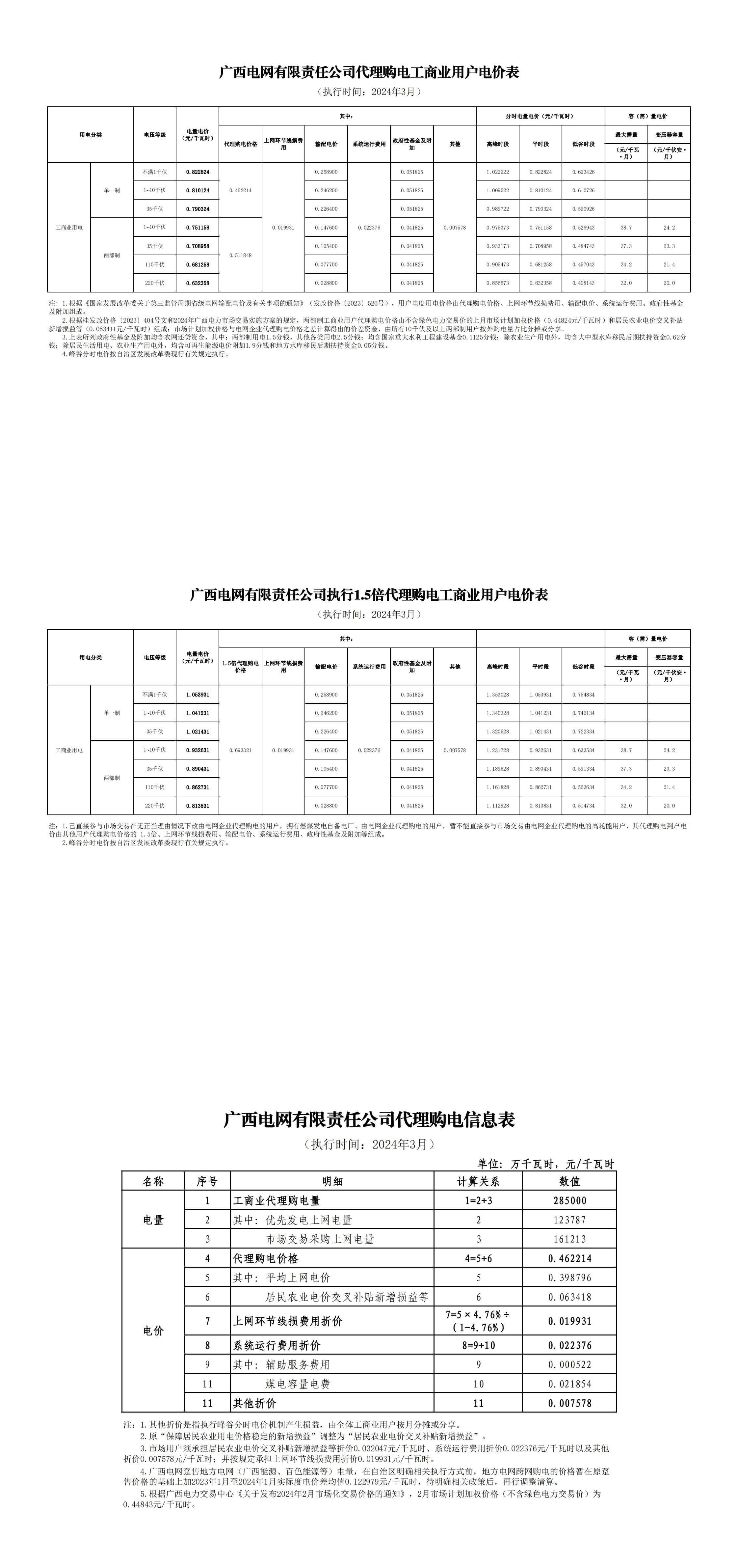 广西省3月份代理购电工商业用户电价表