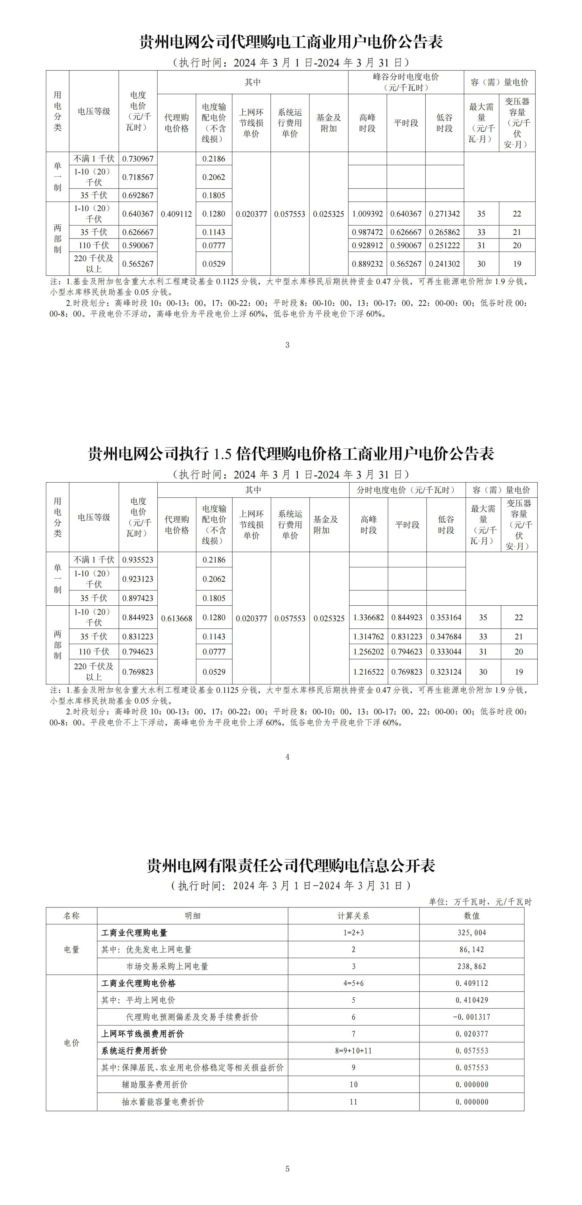 贵州省3月份代理购电工商业用户电价表