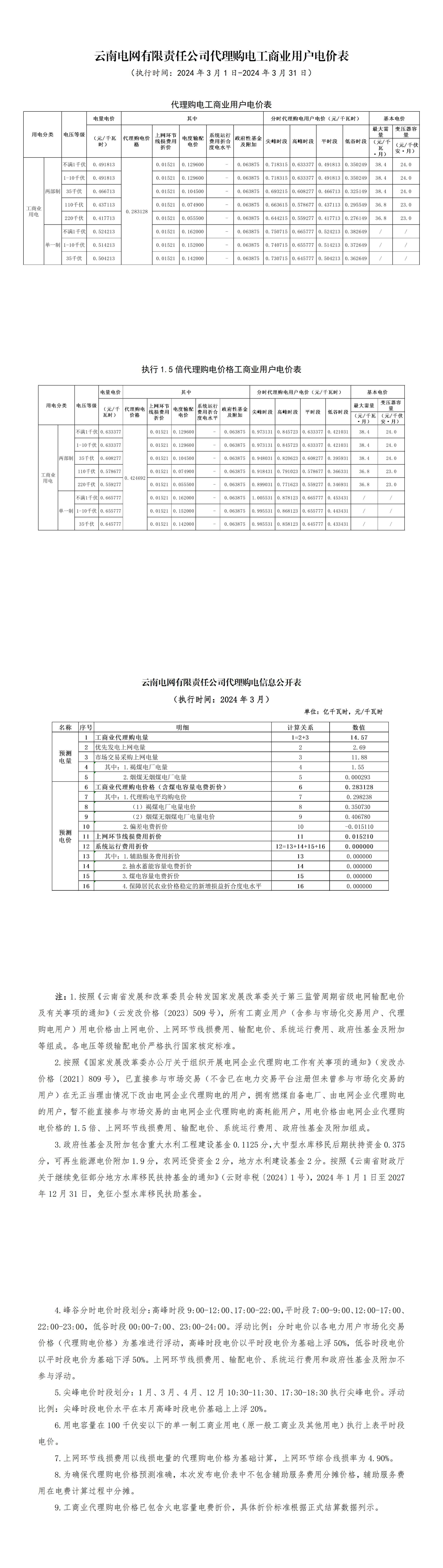 云南省3月份代理购电工商业用户电价表