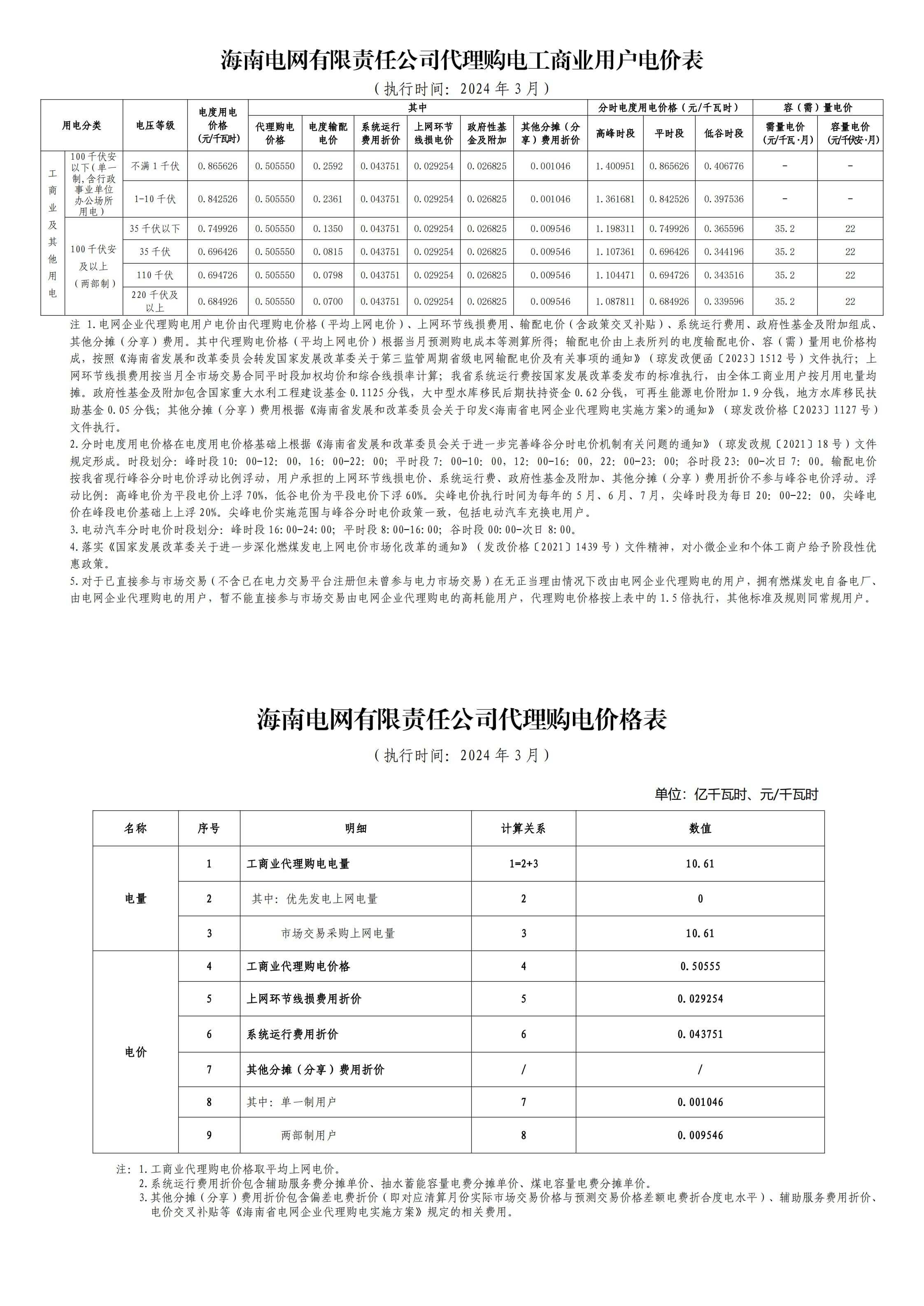 海南省3月份代理购电工商业用户电价表
