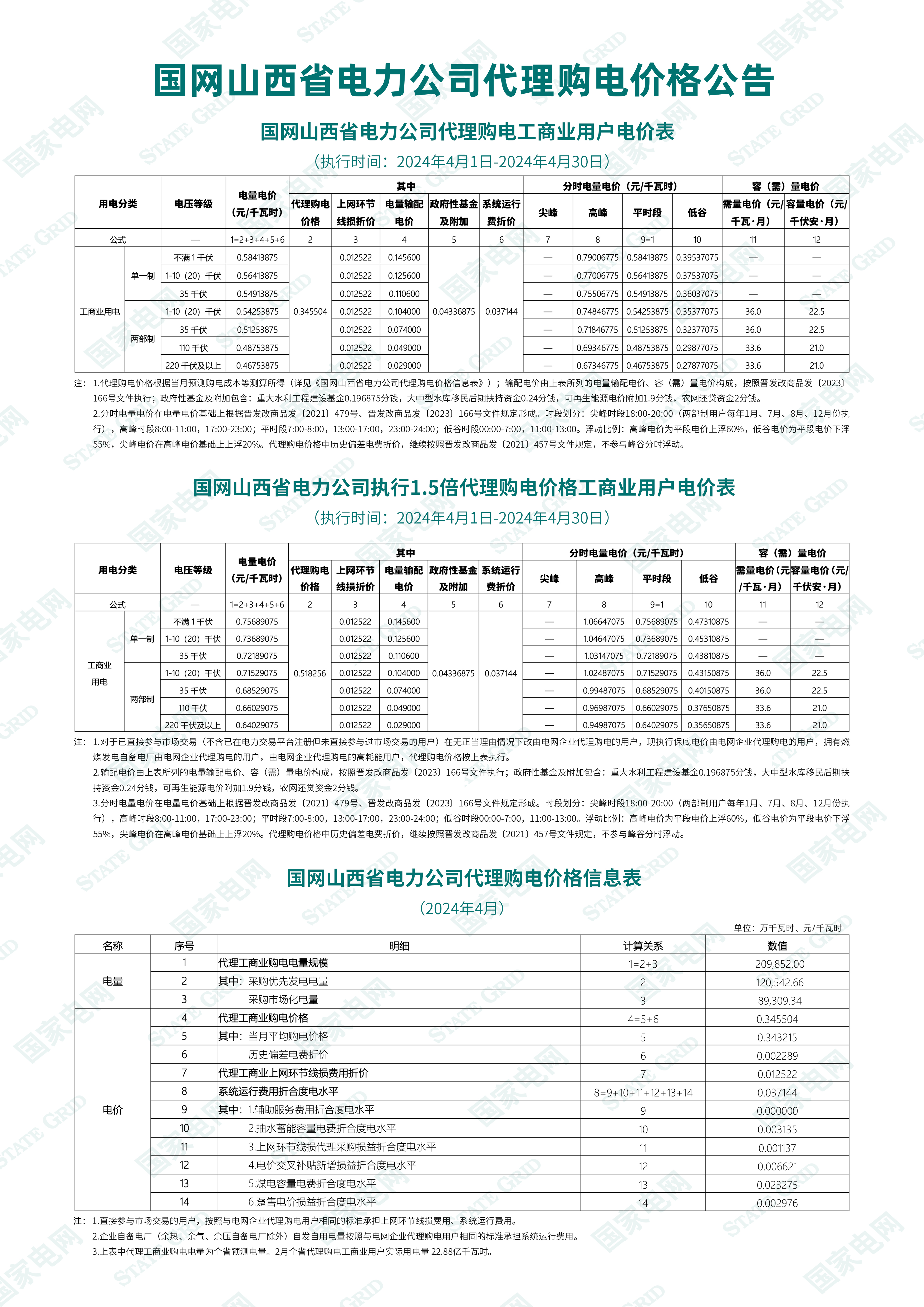 2024年4月份各省工商业电价(北京、天津、河北、山东、山西)