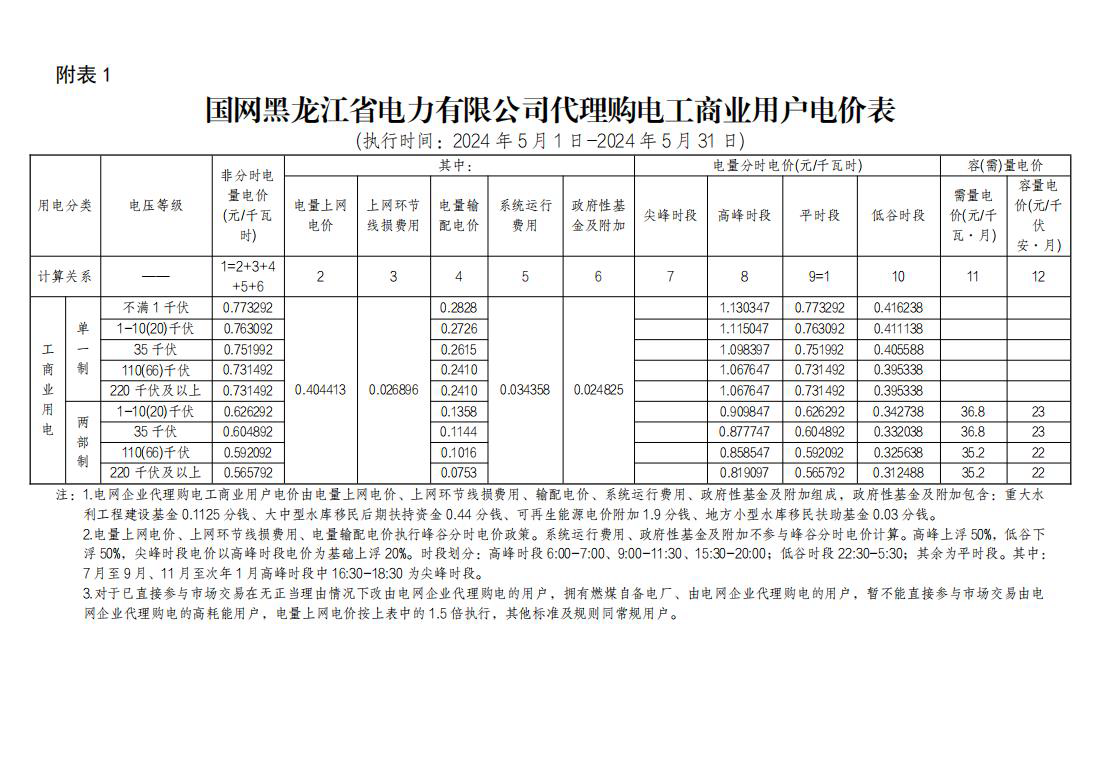 2024年5月份各省工商业电价(黑龙江、吉林、辽宁、内蒙古(蒙东))