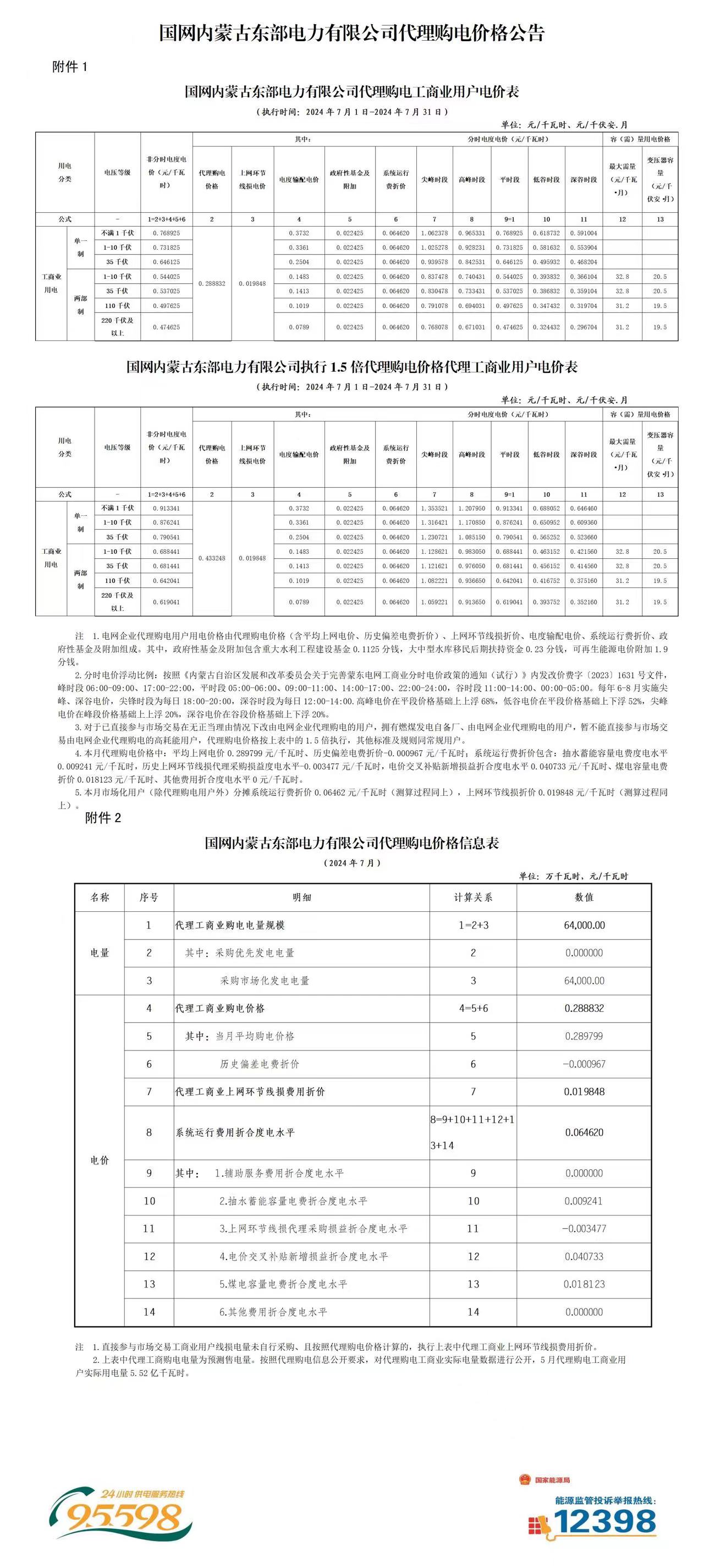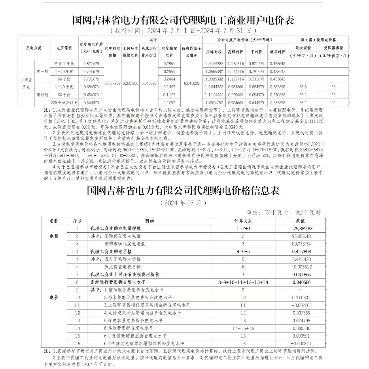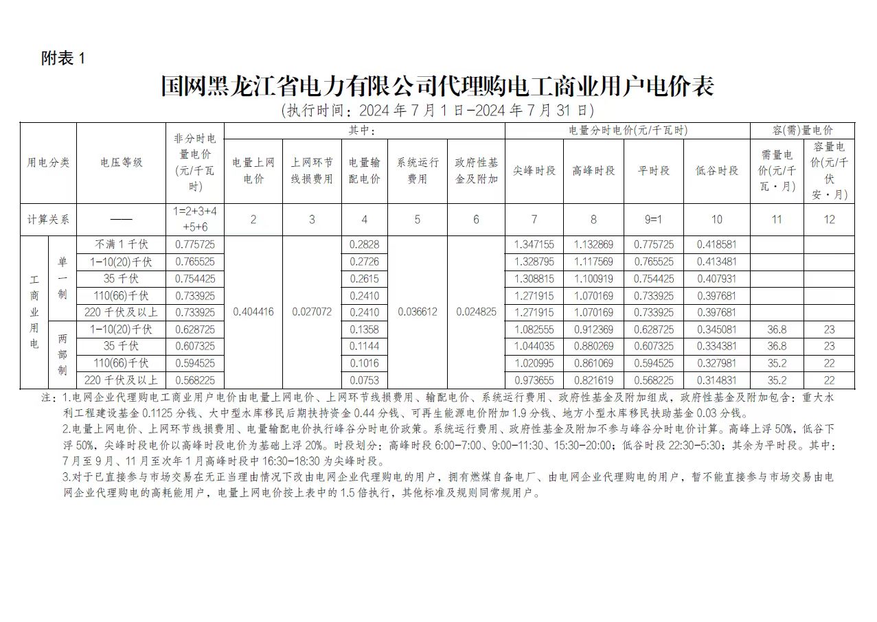 2024年7月份各省工商业电价(黑龙江、吉林、辽宁、内蒙古(蒙东))