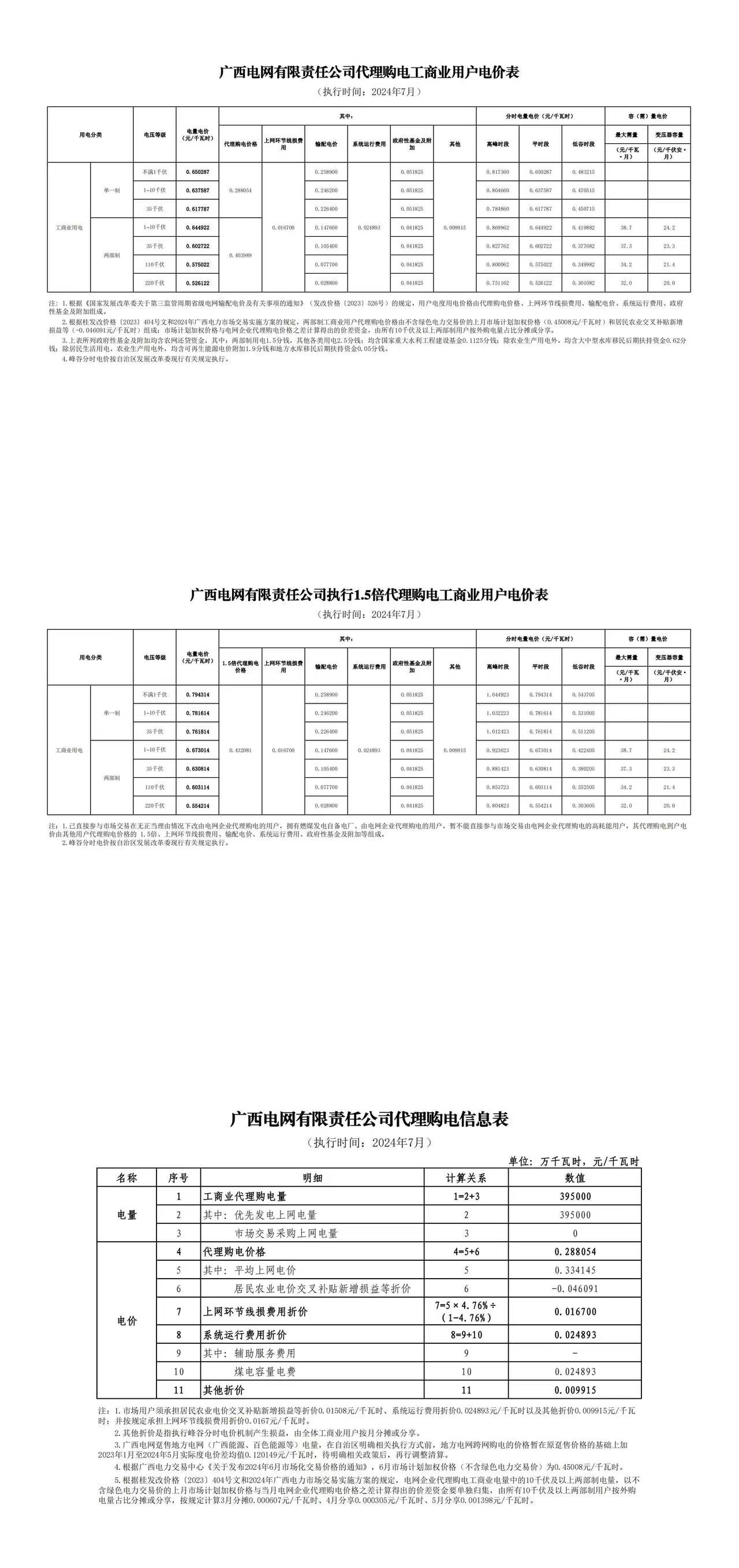 广西省7月份代理购电工商业用户电价表