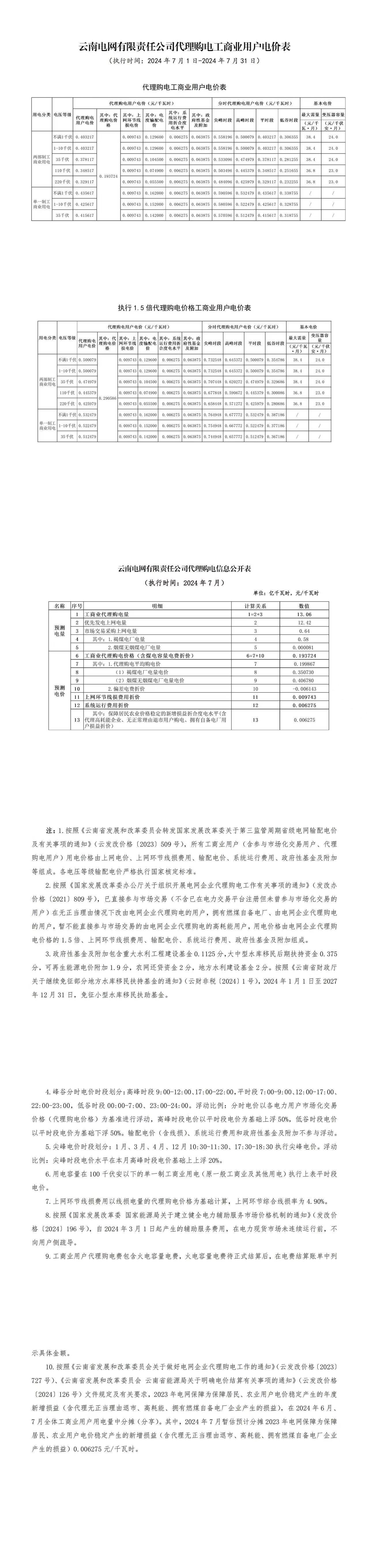 云南省7月份代理购电工商业用户电价表