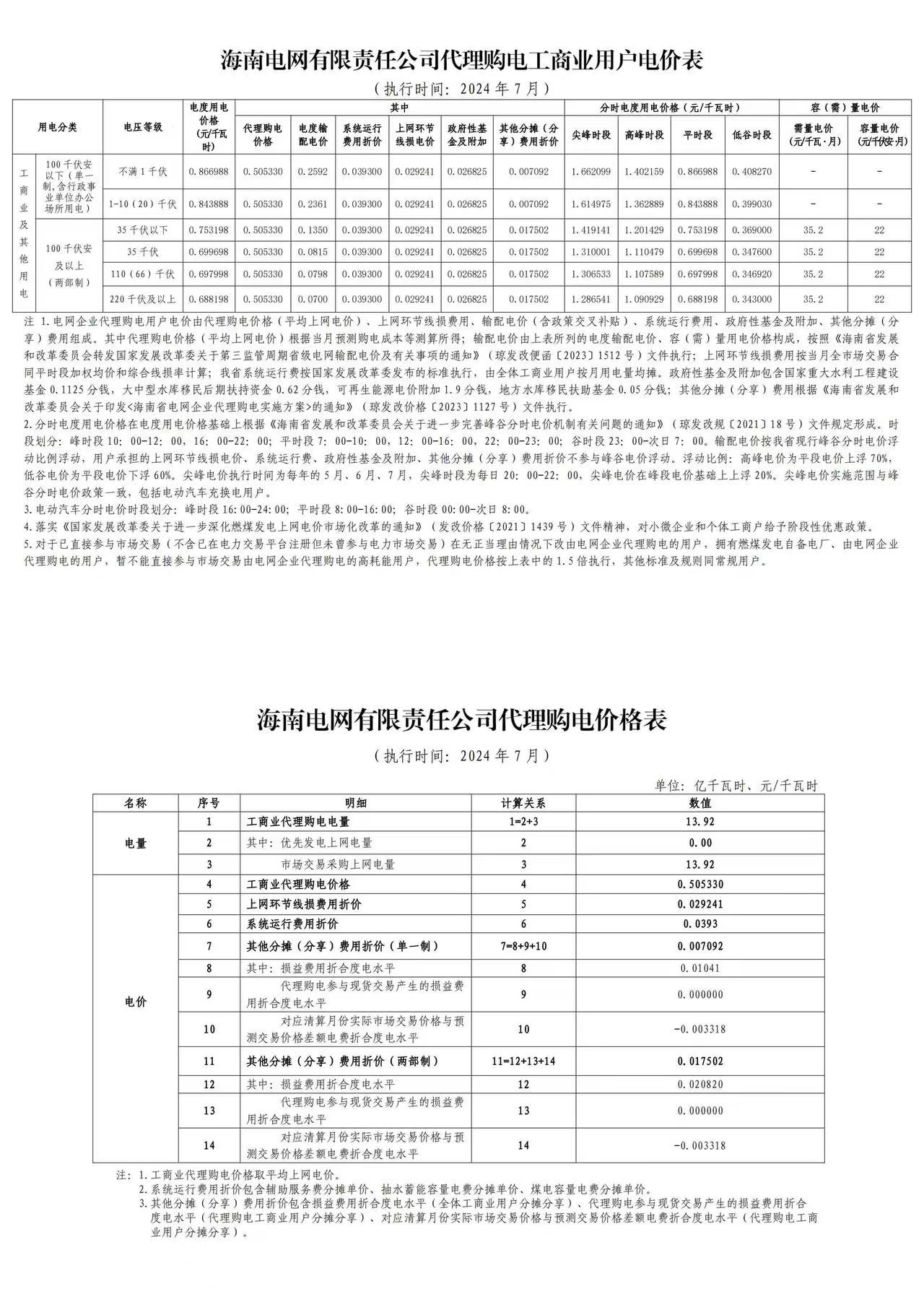 海南省7月份代理购电工商业用户电价表