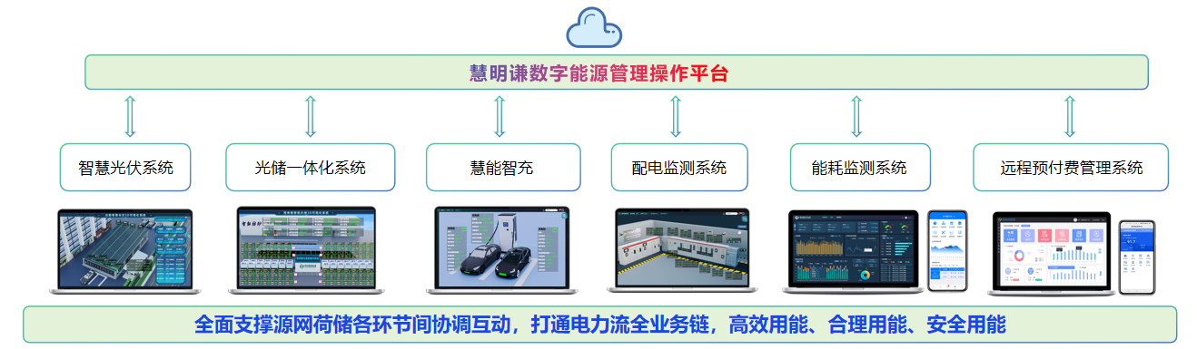 集成六大系统:平台集智慧光伏系统、光储一体化系统、智慧储能监控系统、配电监测系统、能耗监测系统、远程预付费系统为一体,全面支撑源网荷储各环节间协调互动。