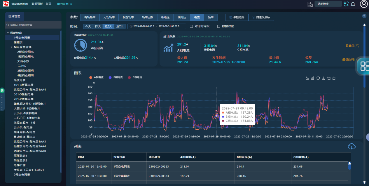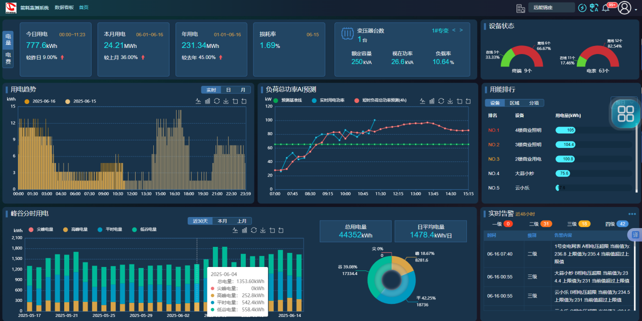 打开首页大屏,水、电、气实时流向以动态图表呈现:今天用了多少、哪个区域最耗能、尖峰平谷各占多少比例、有没有异常告警,所有信息即刻可见。颜色越醒目,问题越紧急,管理者无需翻阅成堆报表,决策效率成倍提升。