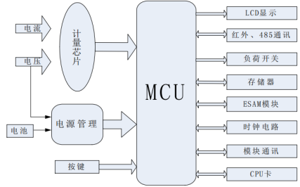 单相智能电表主要由MCU、计量芯片、电压/电流采样电路、时钟电路、通讯模块、存储器、负荷开关、LCD液晶屏等组成。