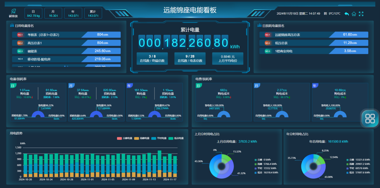 7) 以变压器为单位,按日,按月自动生成用能分析报告,包括供电量、售电量、变压器运行工况及整改建议。