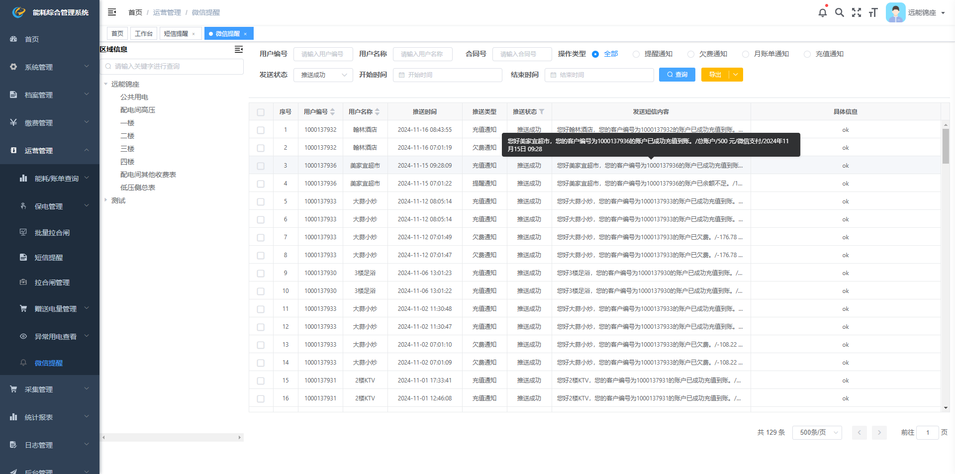 (4) 通知的订阅功能,系统能对用户自动进行短信和微信通知推送,内容包括余额不足告警通知、欠费停电告警通知、月能耗和费用账单通知等。