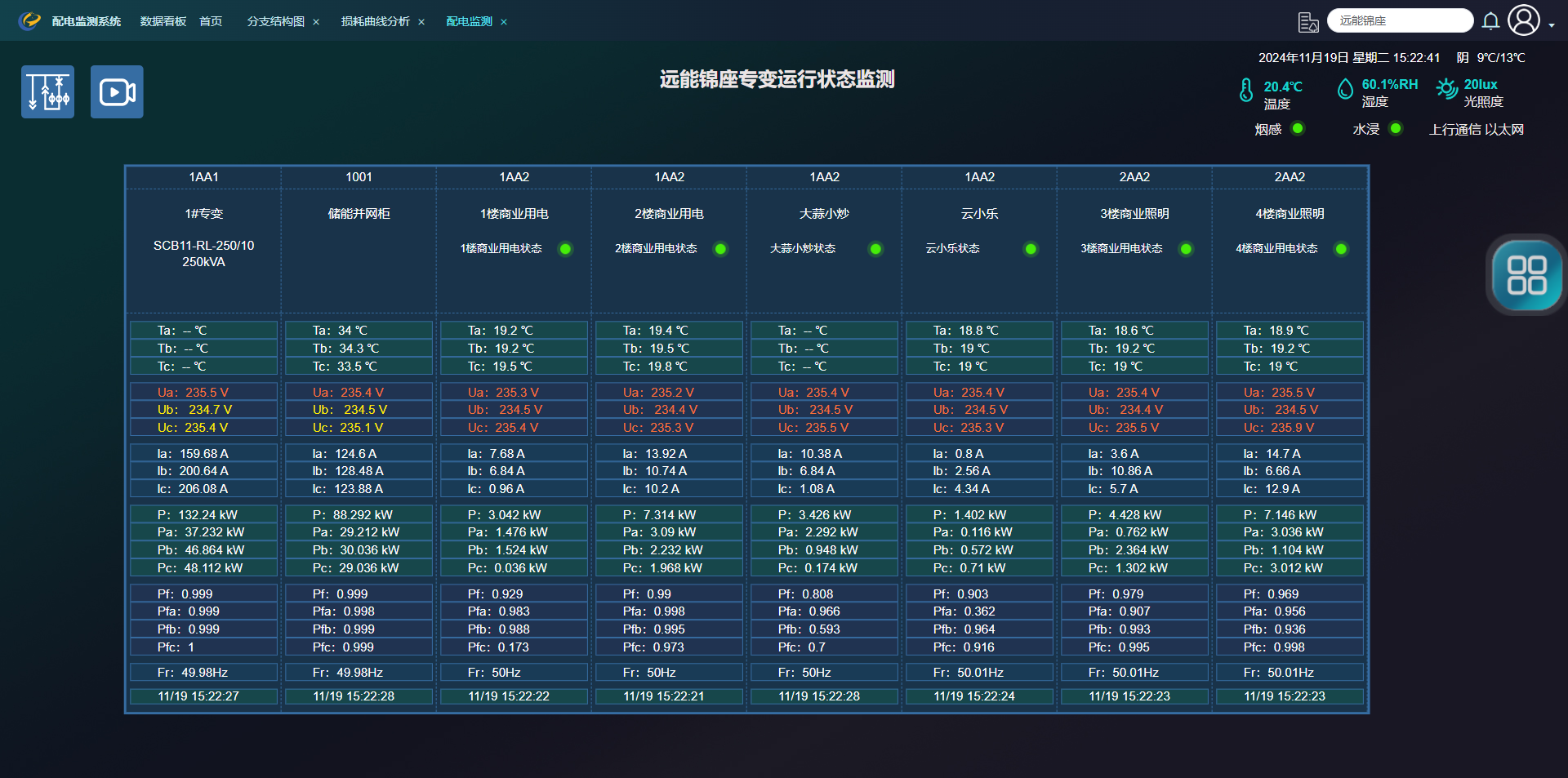 1) 变压器运行工况实时监测,实时检查负荷、电压、频率等工频参数,保证配电系统安全稳定的运行;
