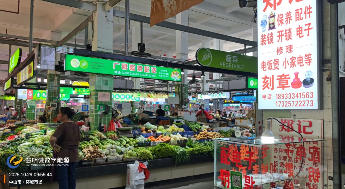 项目概况:中山市环城农贸市场位于广东省中山市石岐区,总占地面积约12亩,建筑面积约8,000平方米。市场规划紧凑、容积率高,拥有超过500个商户摊位,人流量大,用电场景复杂,是中山市规模位居前列的大型综合性农副产品集散地。